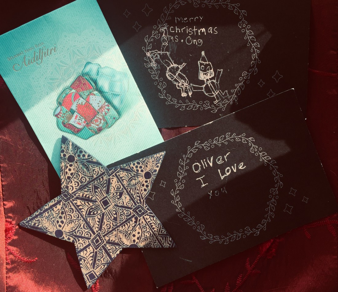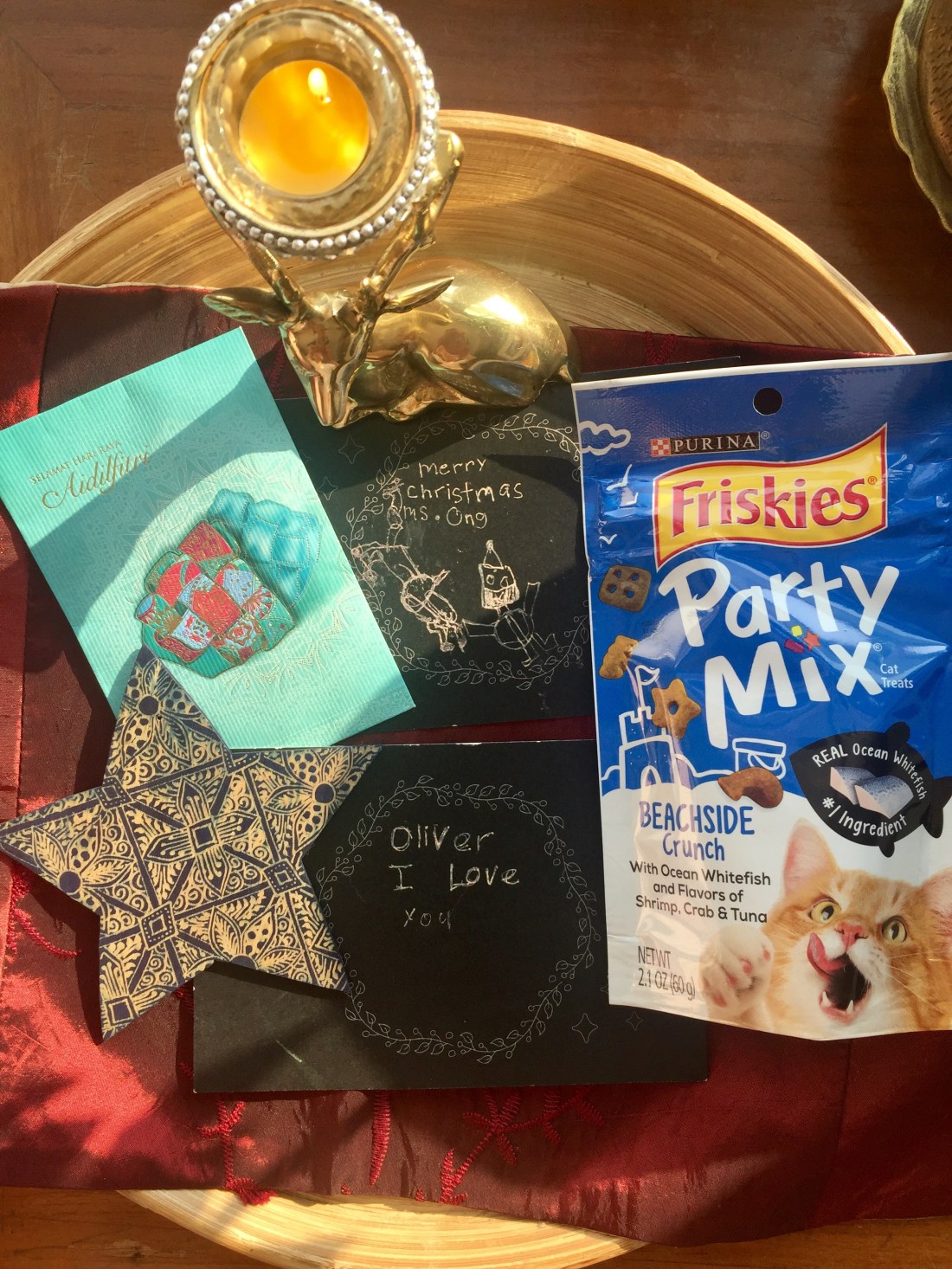 Yesterday I received my first black Christmas card. So did my cat, Oliver. He also received money gift in a Hari Raya envelope to buy cat treats. They were from Niq, my young tutee.