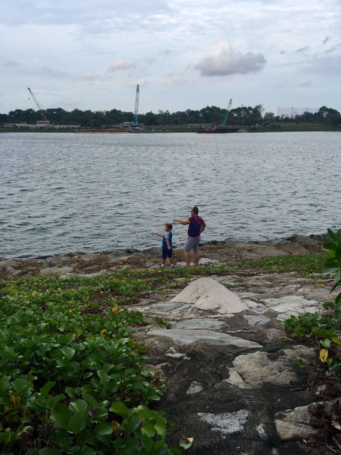 We were at Marina Bay waiting for Moonrise. Meanwhile as he explored the grounds, he learnt about rising and falling tides and how they bring in shells & garbage that get stuck on the coastal vegetation when the tide retreats.