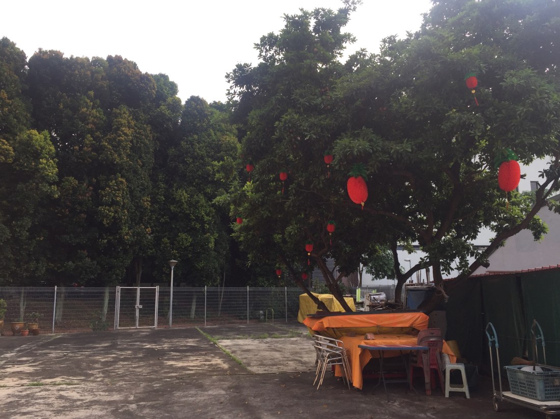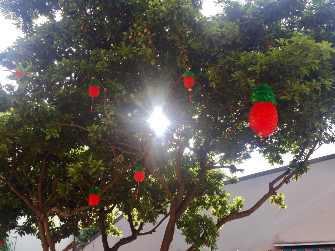 Red paper craft hanging from her branches like ribbons on a maiden’s hair gave the old tree a touch of festive air.