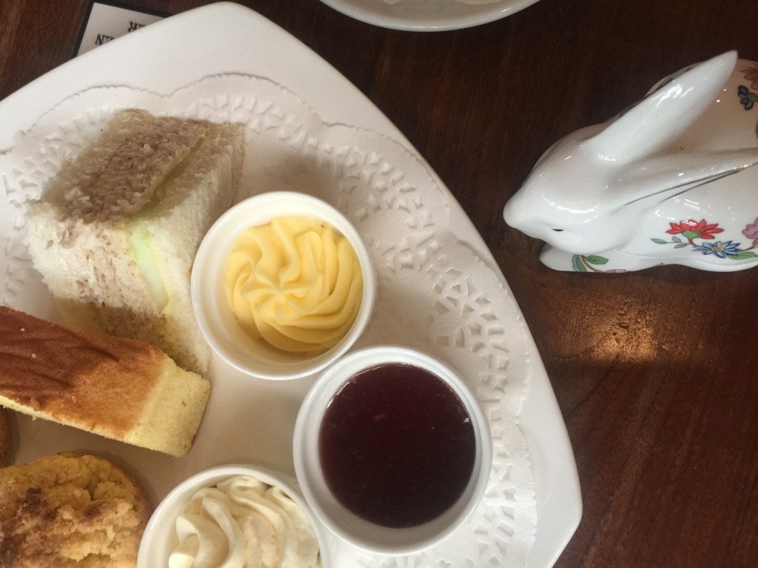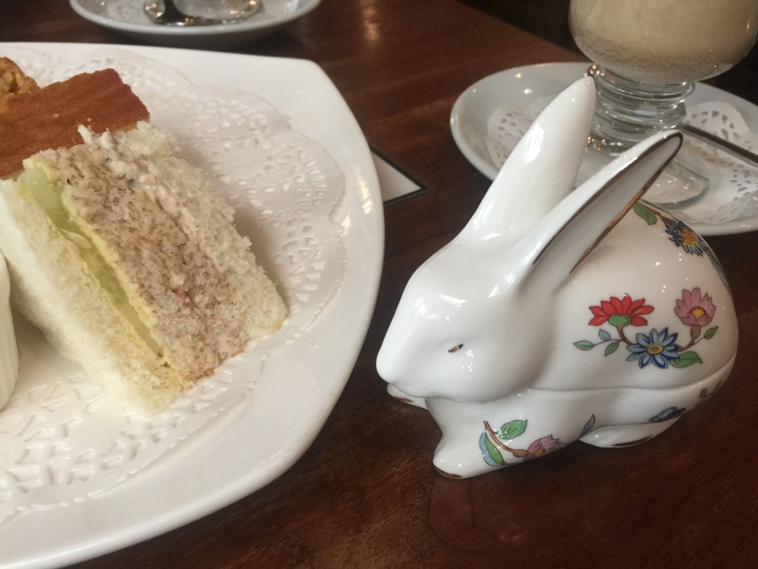 So there we were, Sharonne and I, two elderly Rabbits amidst the very English setting of Foster’s, munching on freshly baked scones and gushing over the REAL paper doily that lined the plate, while the delicate antique rabbit that had travelled all the way from Holland to Singapore looked on quietly.