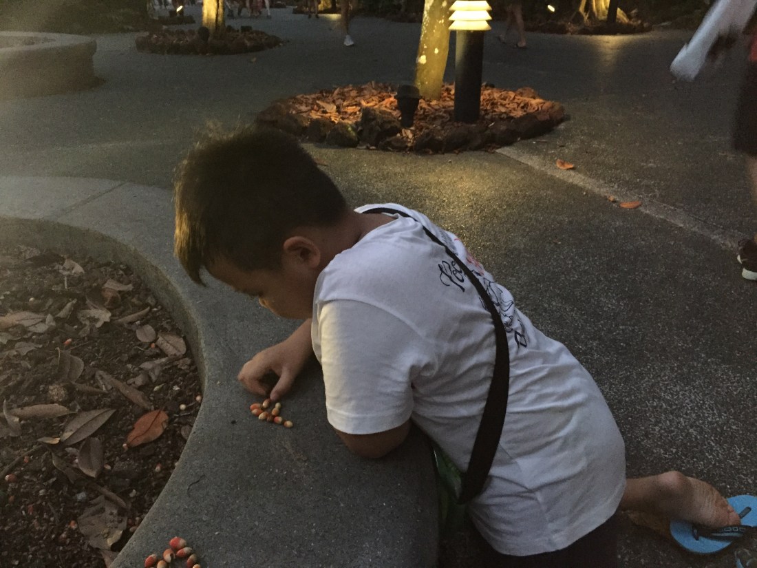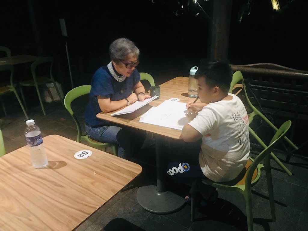 Earlier on when we arrived at the Botanic Gardens for our English Language work, he didn’t run head on to play. Instead the first thing he did was to point out the corner table where he planned to practice spelling later.