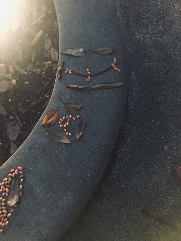 He tries to resist the impulse to turn every tree branch within his reach into monkey bars. Instead, he has learnt to pause and pat the trunk reverently. Last Sunday he made art with a tree’s fallen fruits.