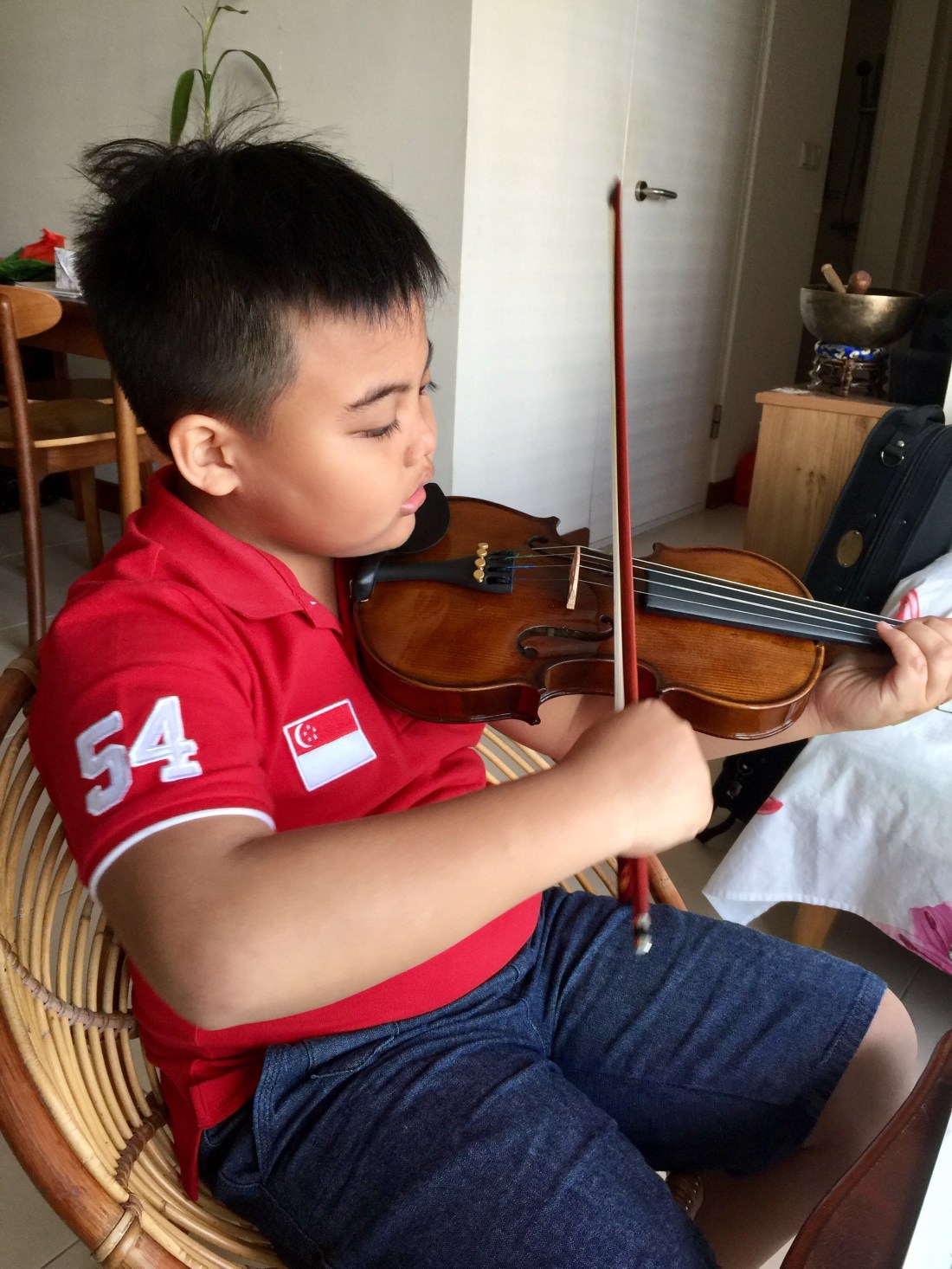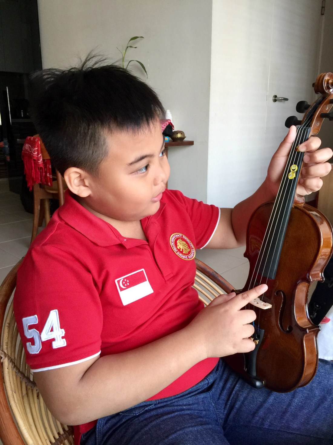 Me: For today’s session, we have to complete 3 things – Spelling, make a birthday card for Singapore & play the violin. You can decide on the order in which these work are to be completed.