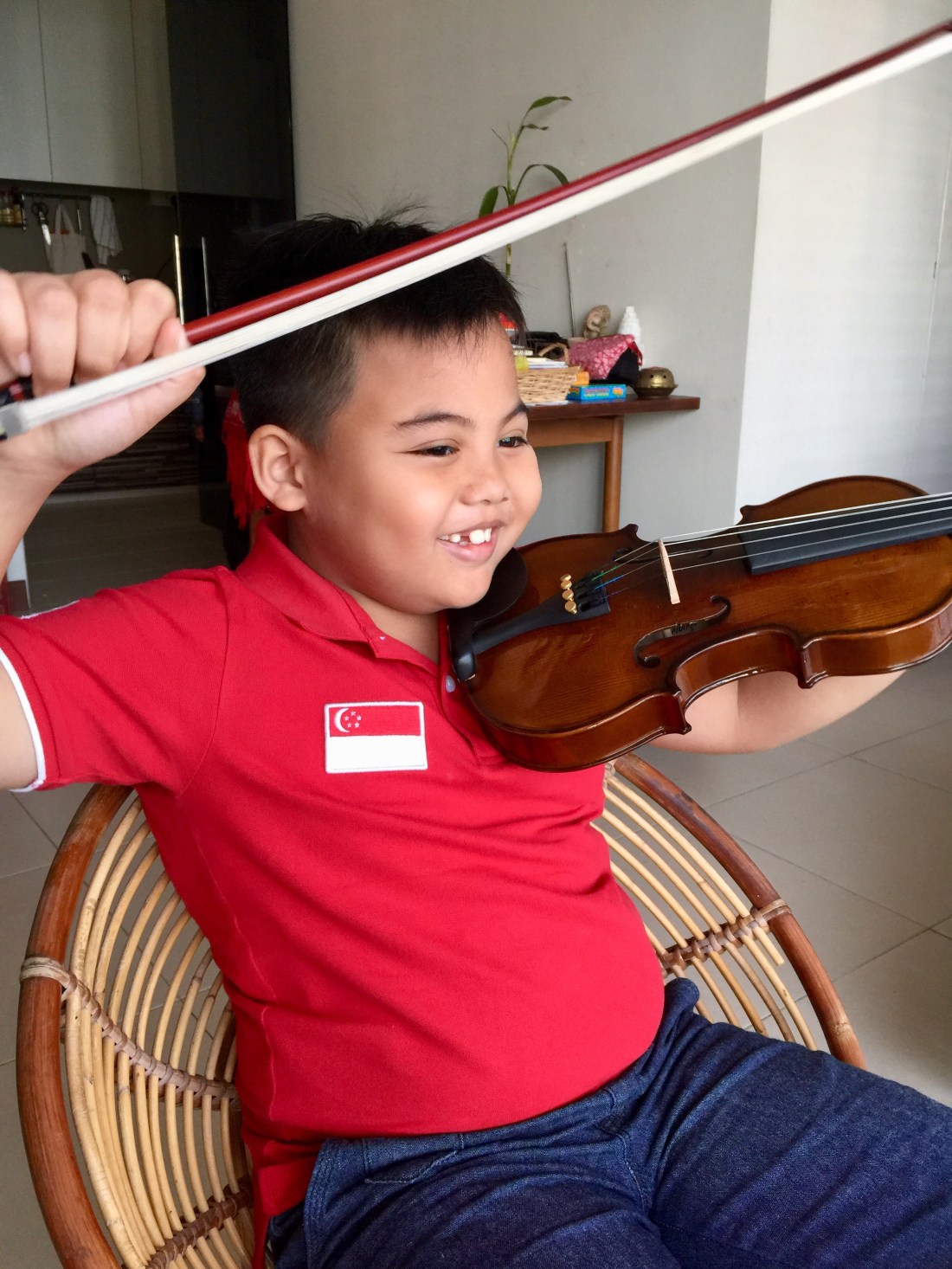 Me: Ladies and Gentleman, we’re very honoured to have in our studio today, a lovely boy who will play the violin for us.