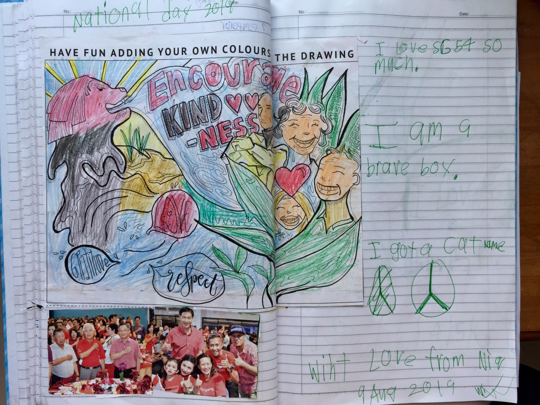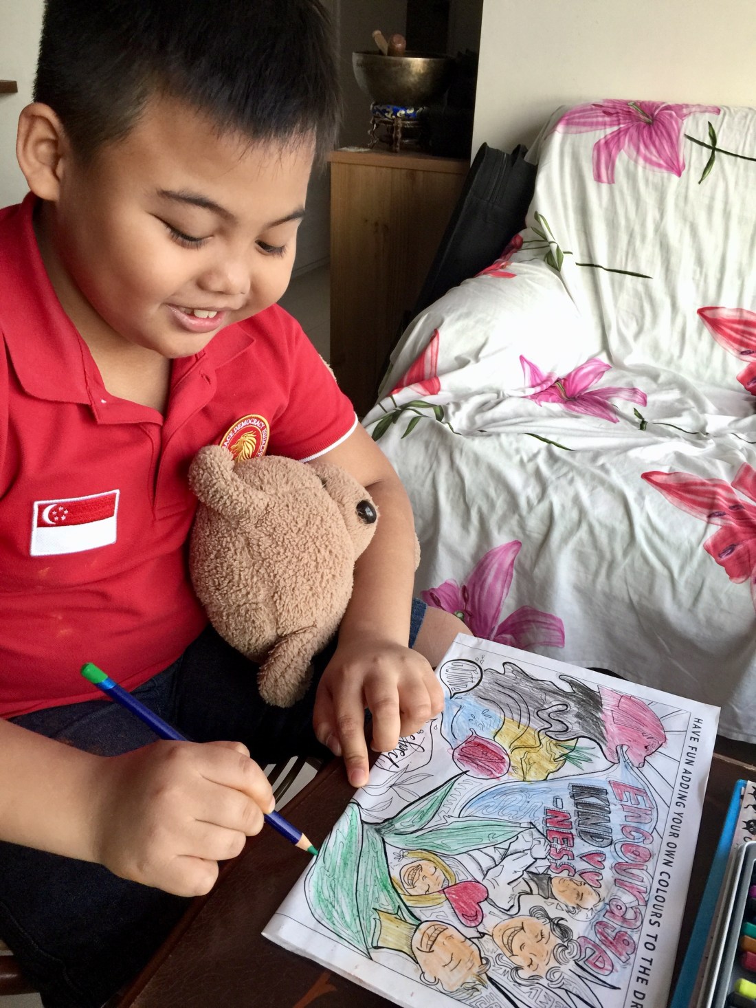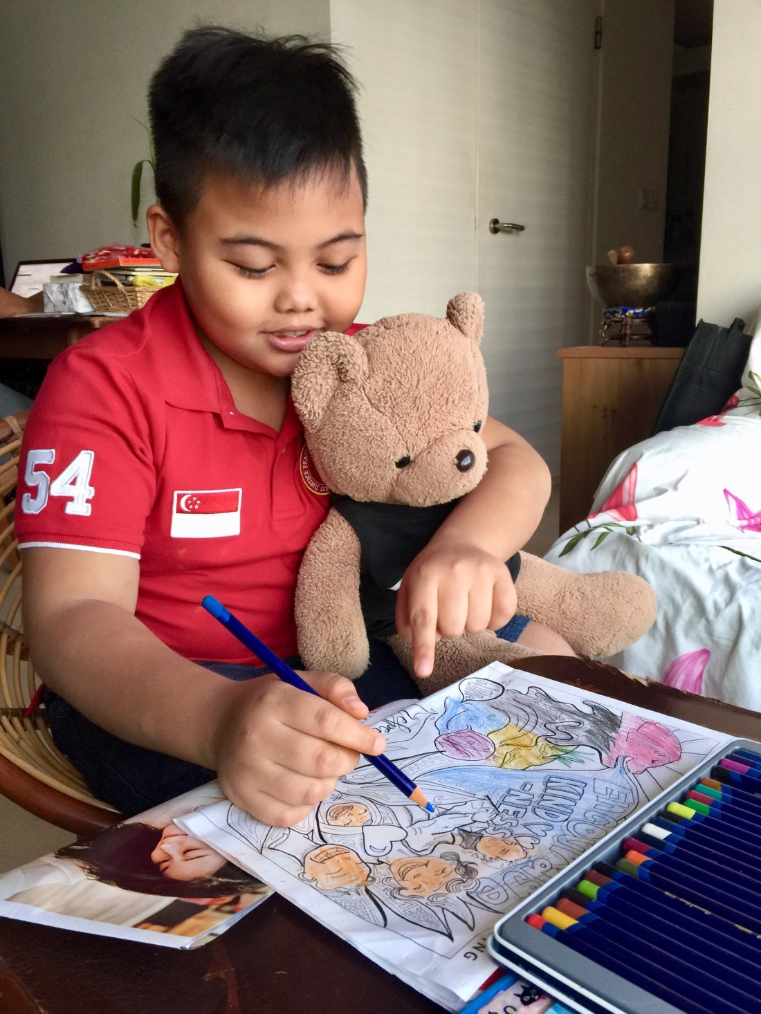 “Singapore is a girl you know,” First Tutee said without looking up. He also added that he always asked his Teddy Bear, Hafif, on what colours to use next. Then he put the bear close to his ear to show me how the consultation happened.