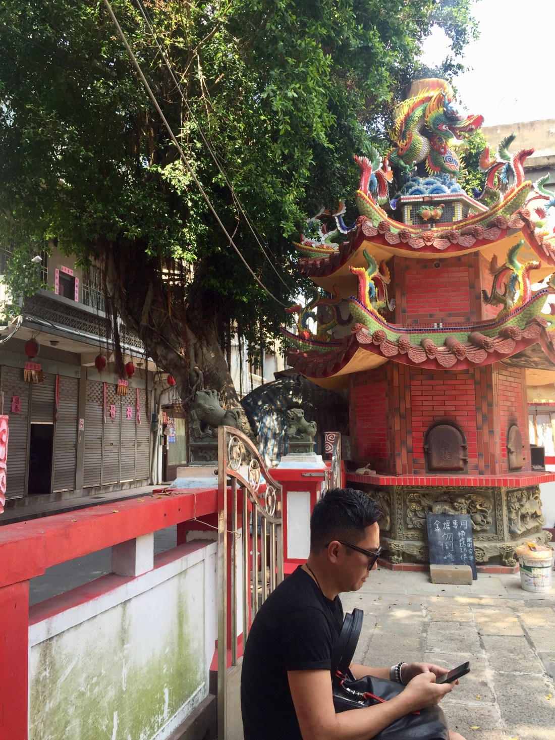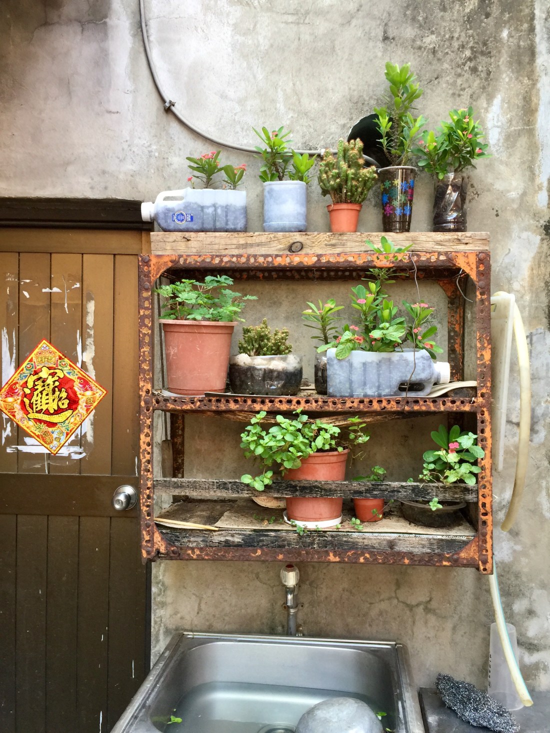 I was resting in the temple courtyard when I chanced upon this rusty rack holding up containers of beautiful young plants.
