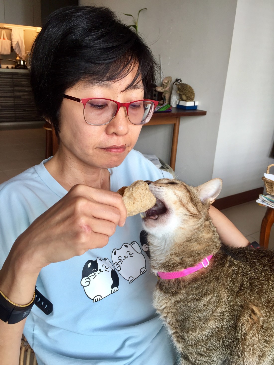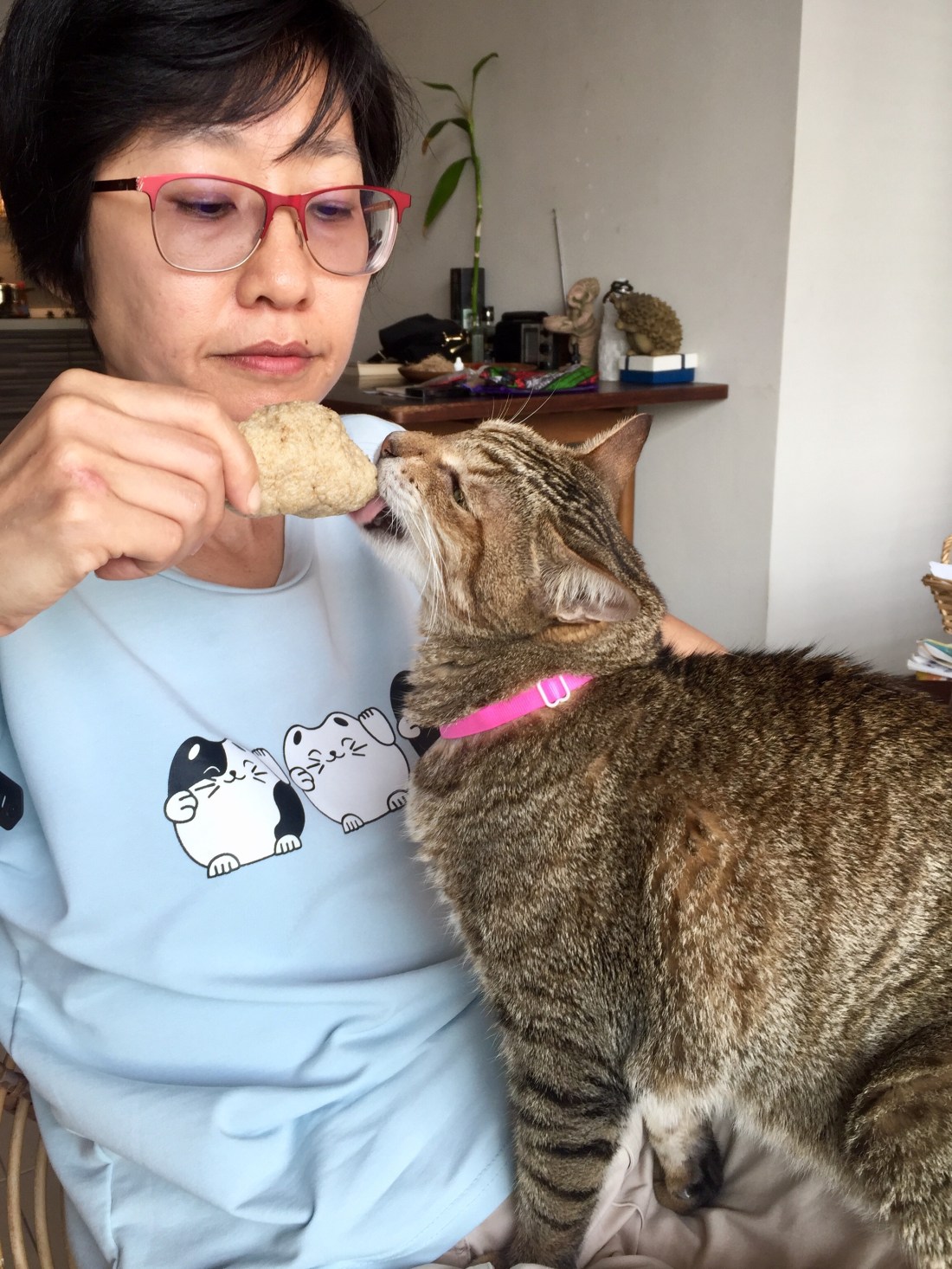 But when he saw the fish cracker in HK’s hand, he promptly dropped his contempt and hopped onto her lap.