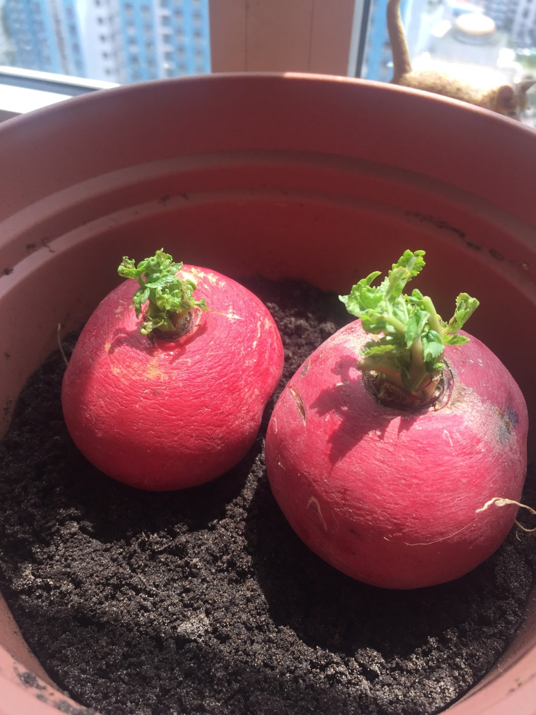 While I celebrate the proliferation of leaves on one radish, I am even more grateful to the other for just trying to survive.