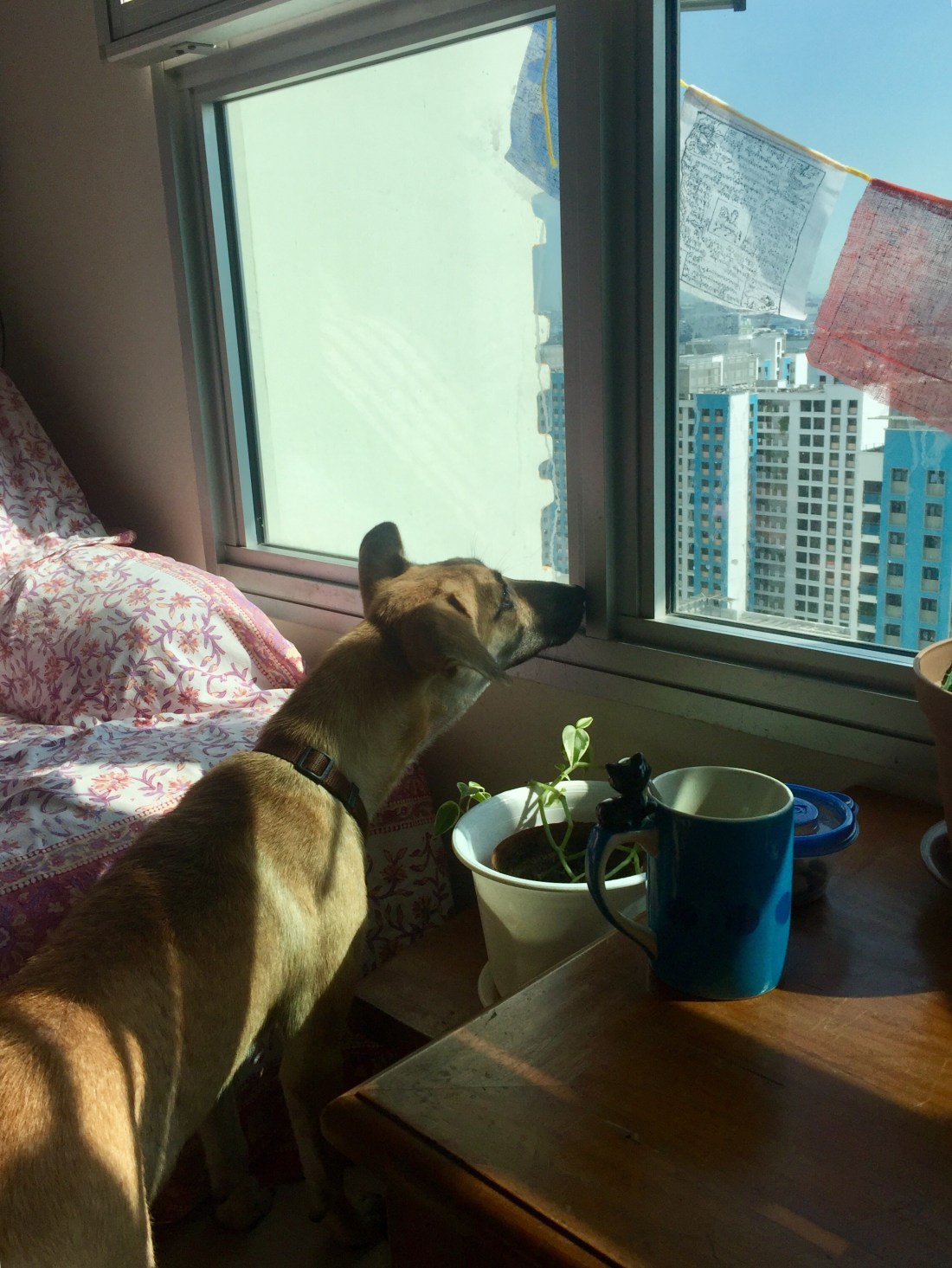 Satisfied with her exploration, the girl dog lay down contentedly on the floor by the altar while raising her head briefly to look up at Avalokithesvara (Compassion) and Ganesha (Wisdom).