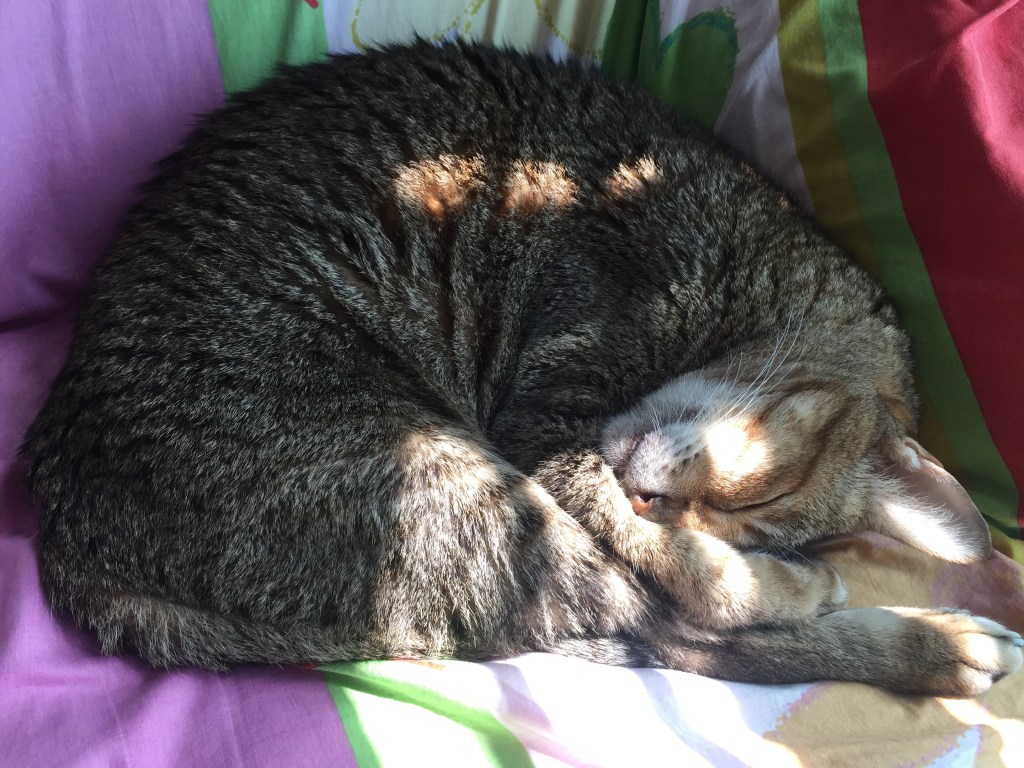 A shaft of light against the wardrobe, a set of gold rectangles on the floor and speckled shimmers on a cat’s fur all announce the Sun’s arrival!