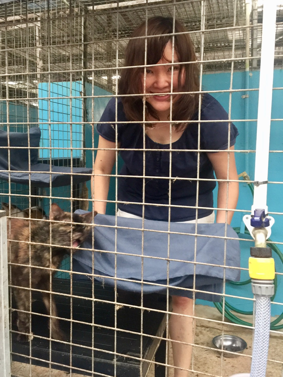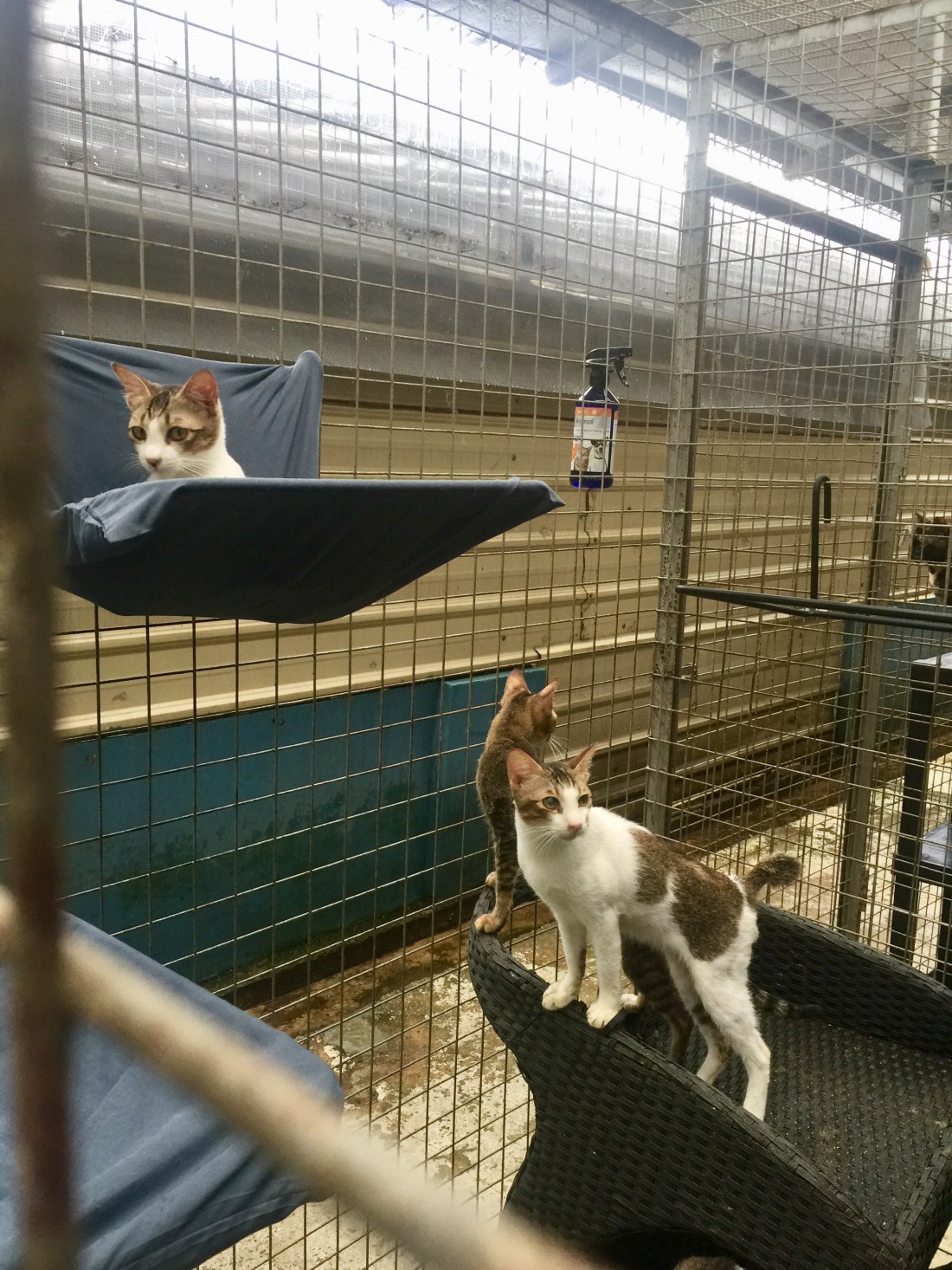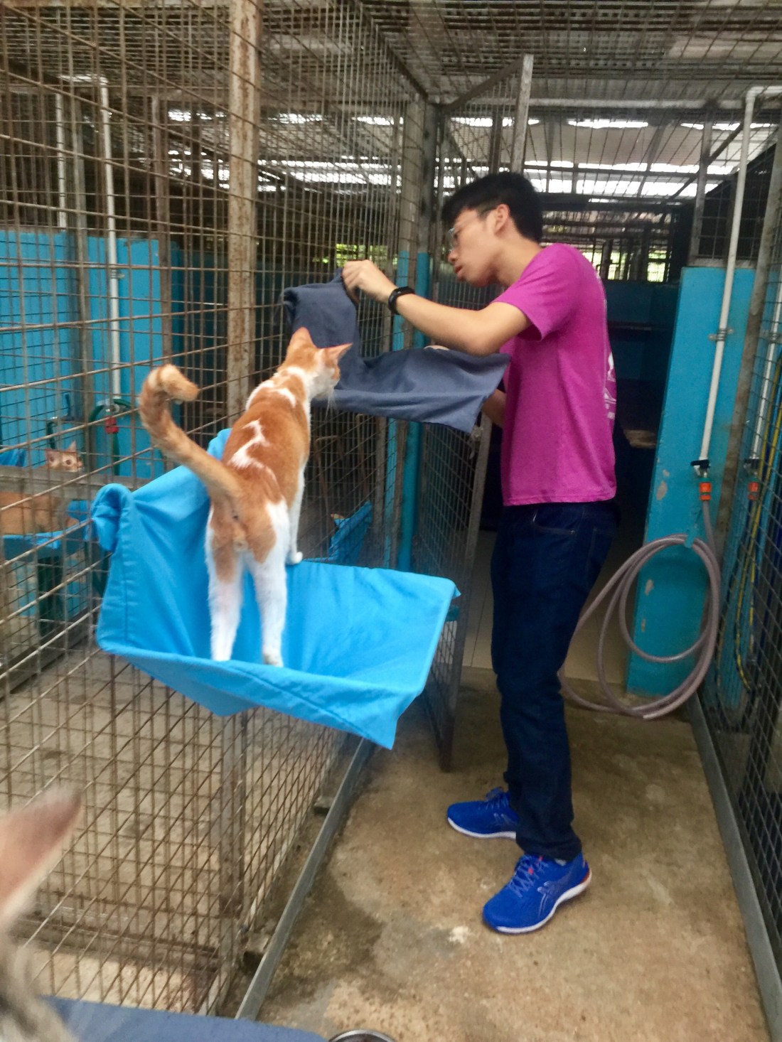 So the morning went by with us unwrapping metal frames, hooking them to each enclosure to increase vertical space for the cats, and slipping pillow cases over the frames to form beddings for the feline occupants to sleep comfortably above ground.