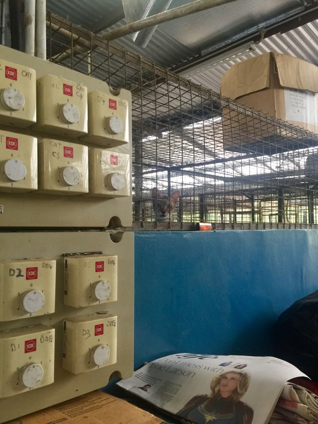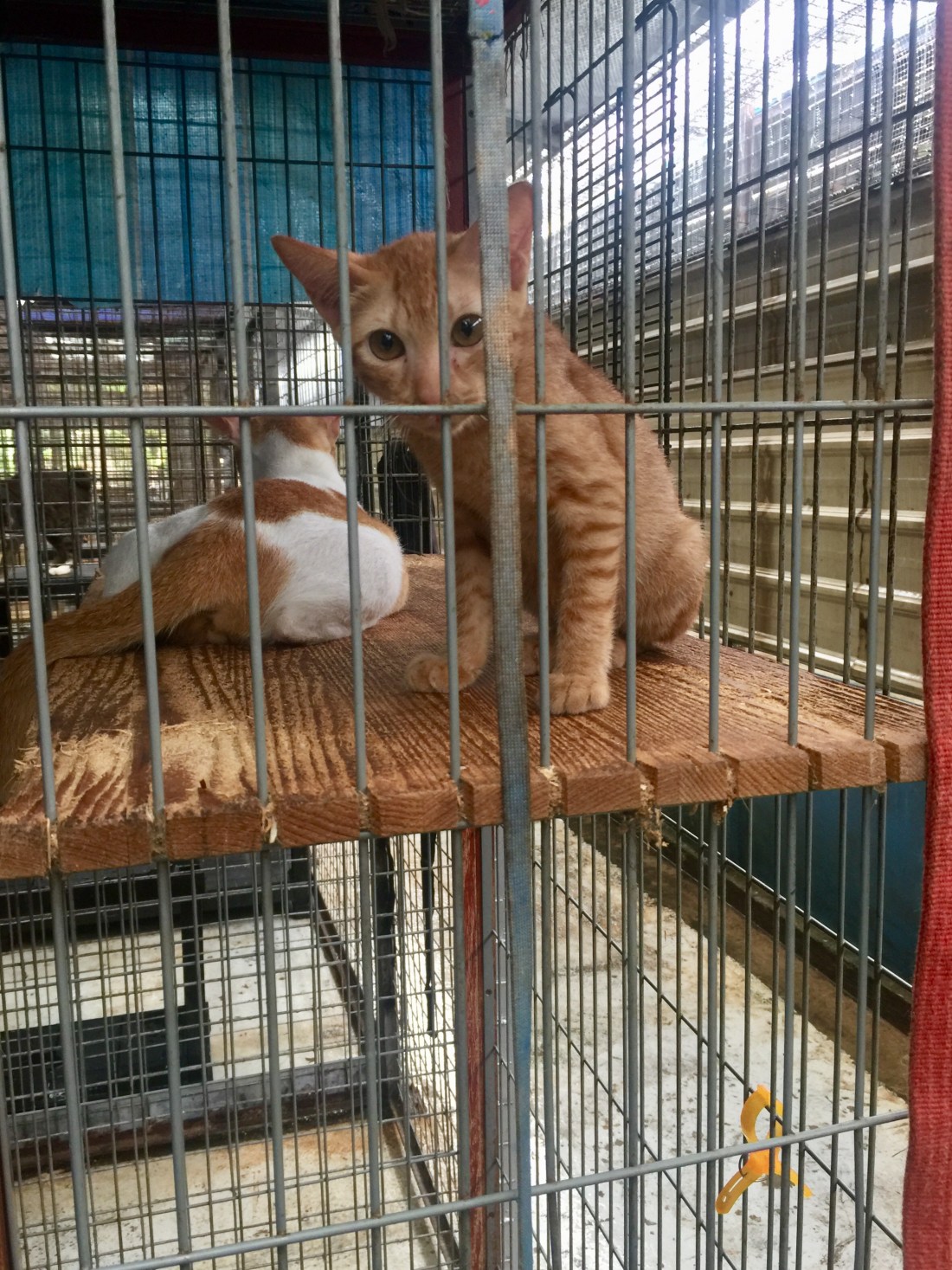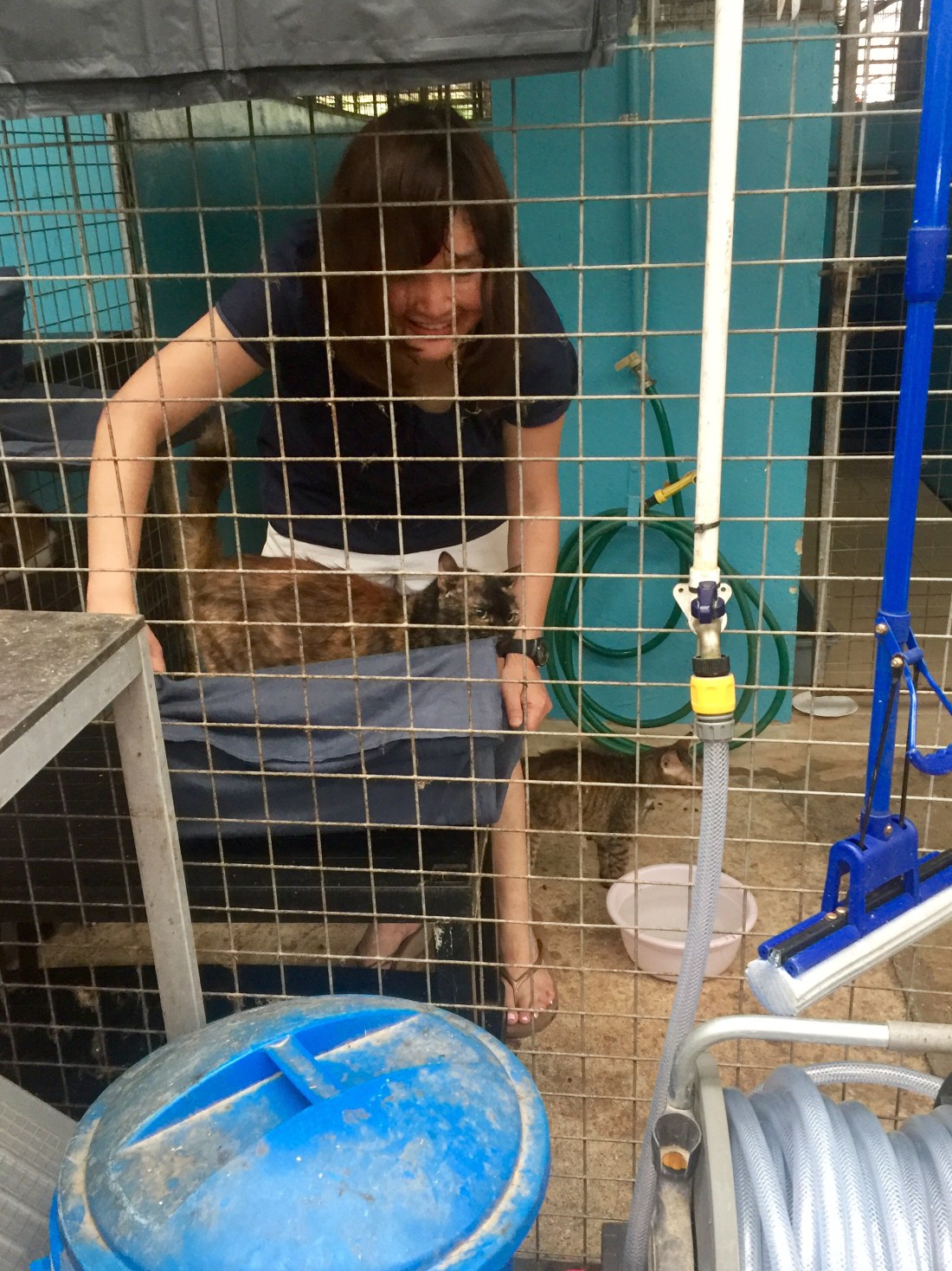 So the morning went by with us unwrapping metal frames, hooking them to each enclosure to increase vertical space for the cats, and slipping pillow cases over the frames to form beddings for the feline occupants to sleep comfortably above ground.