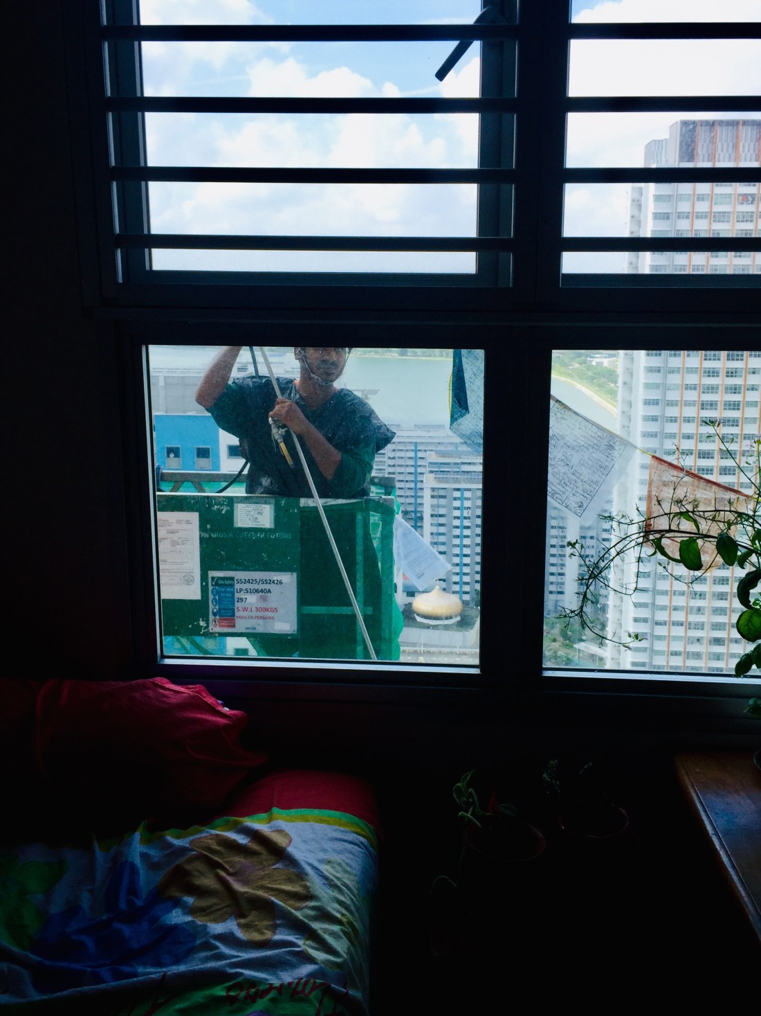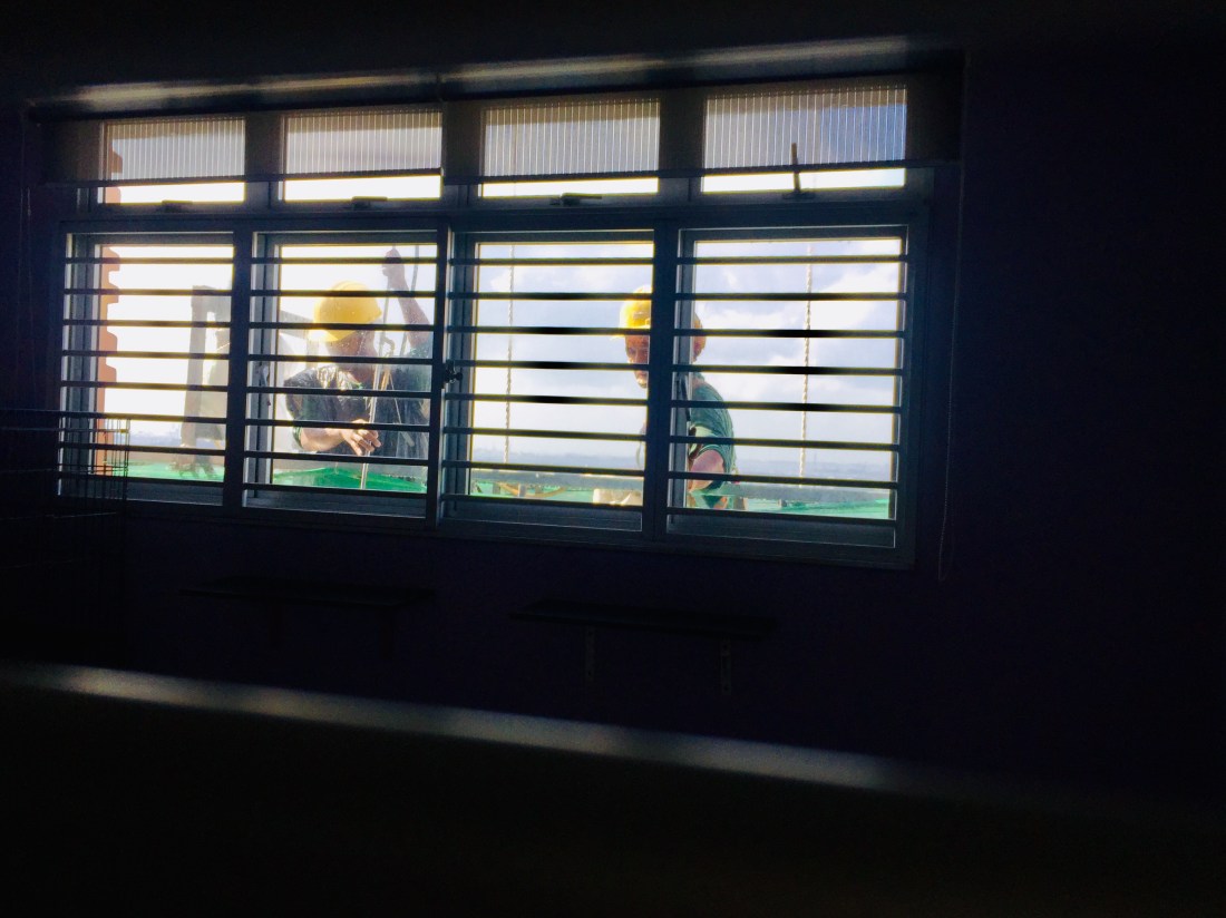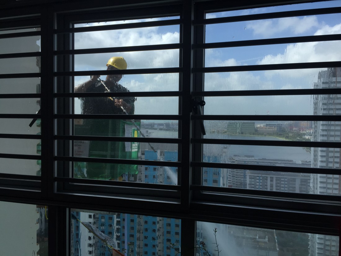 At each unit where the windows were left opened by absent owners, the workers doing the block washing used a metal rod to push shut the window panels before they started directing jets of water to remove dust & dirt.