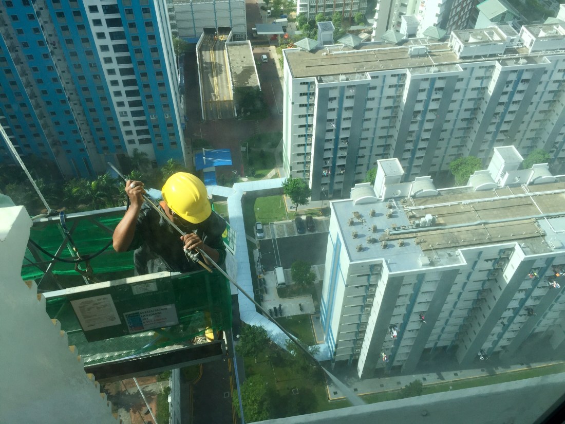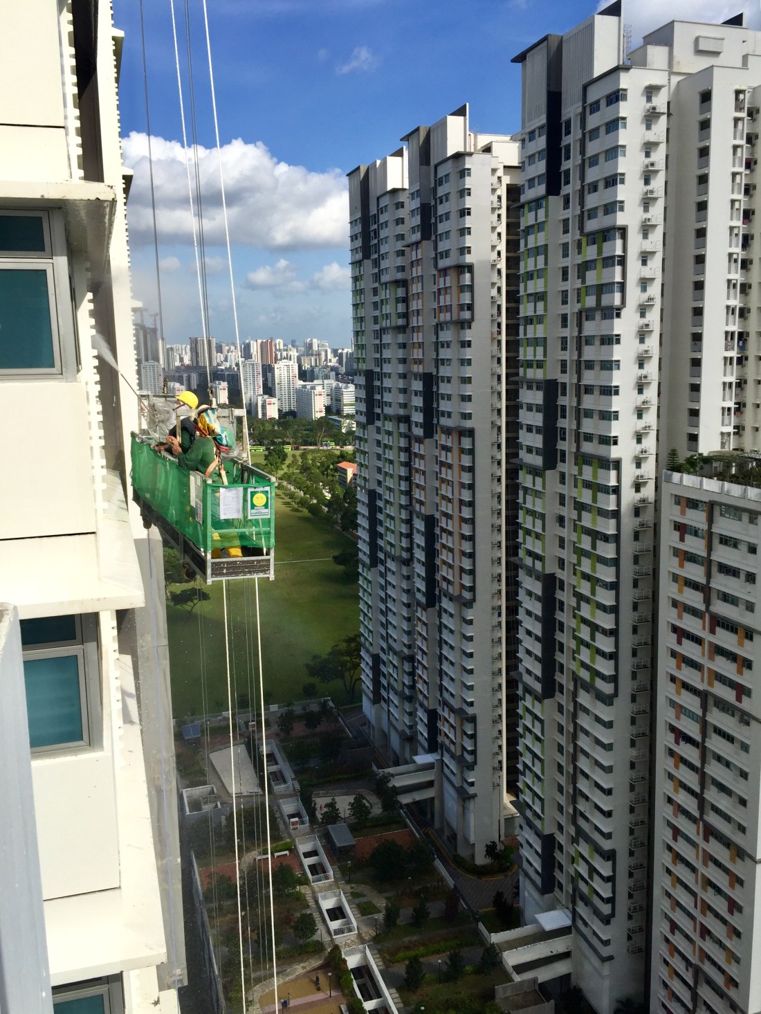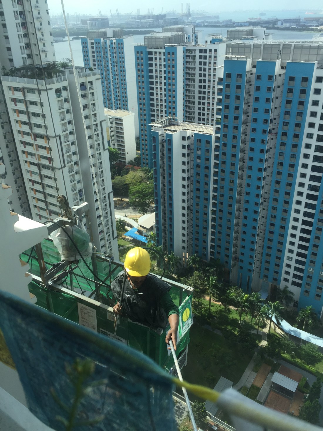 At each unit where the windows were left opened by absent owners, the workers doing the block washing used a metal rod to push shut the window panels before they started directing jets of water to remove dust & dirt.