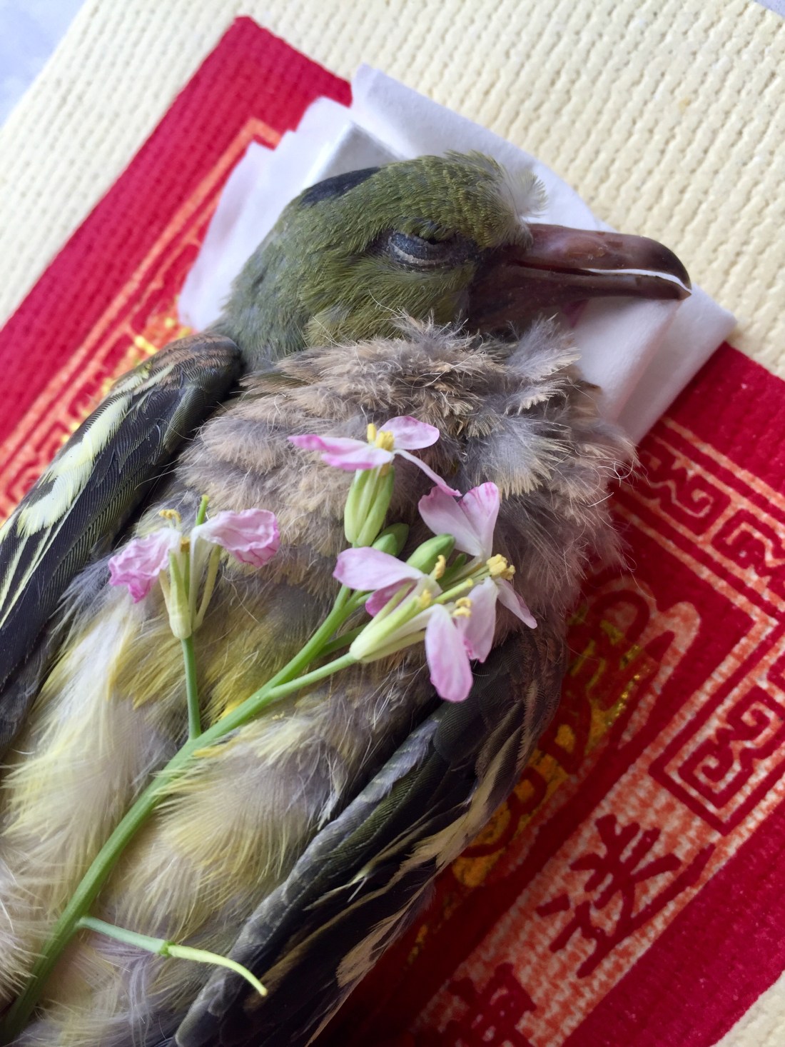 It was very unfortunate that this bird, still a fledgeling herself, met her end so soon. Her soft feathers of black, green & yellow were not yet fully grown. Parts of her delicate skin were still visible under the downs. I found out later that she was a Black-naped Oriole.