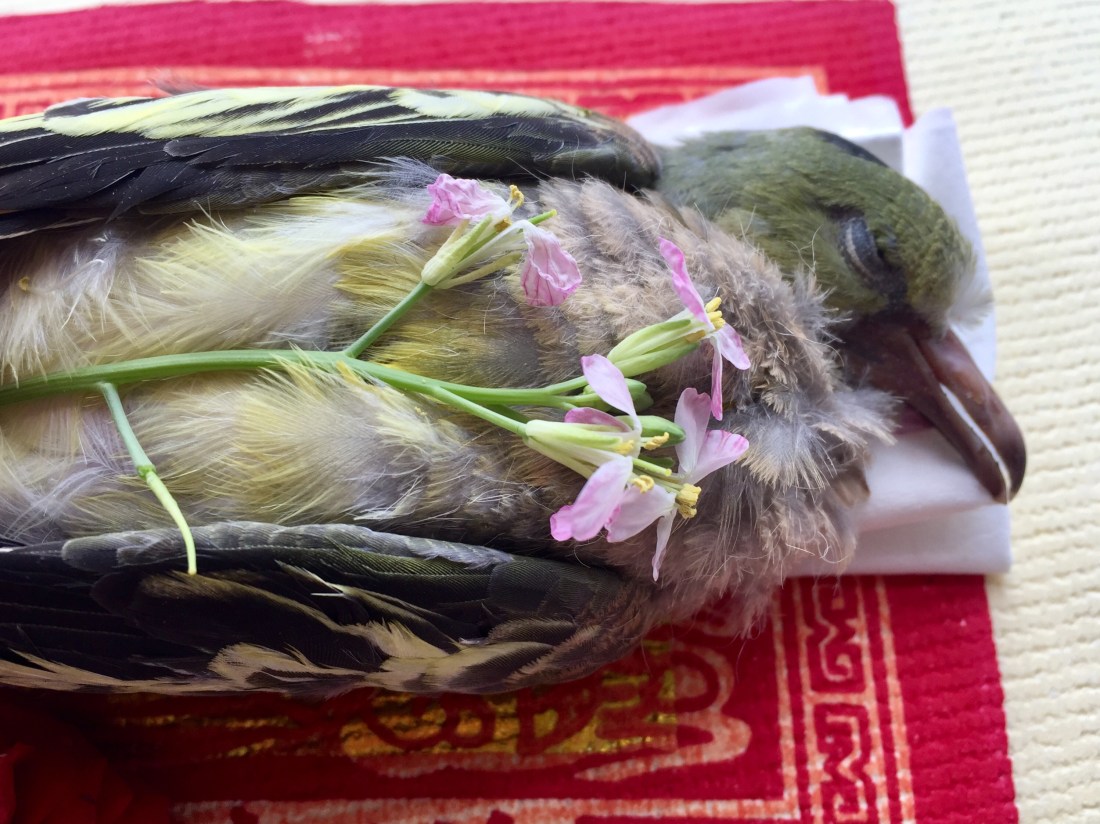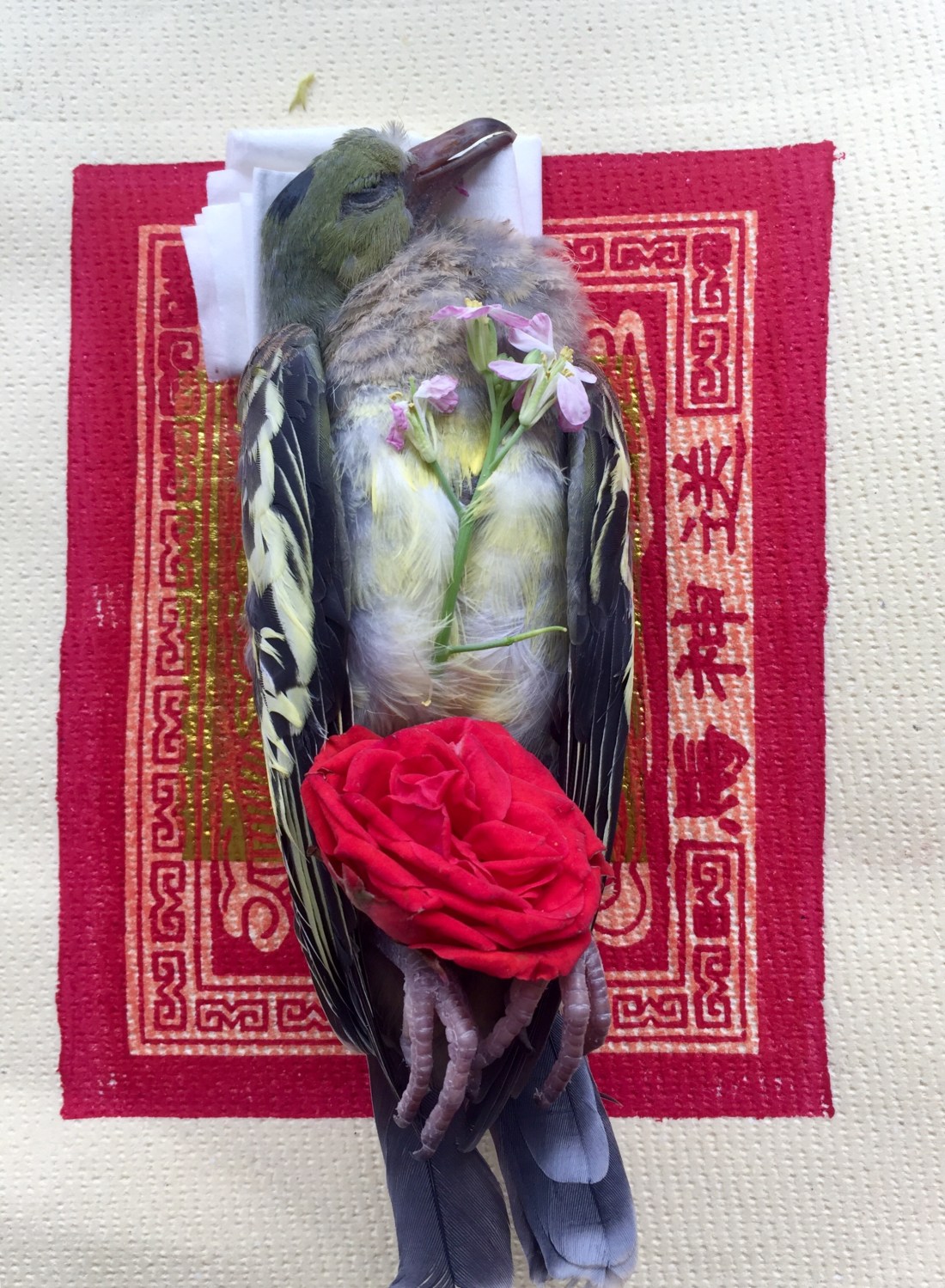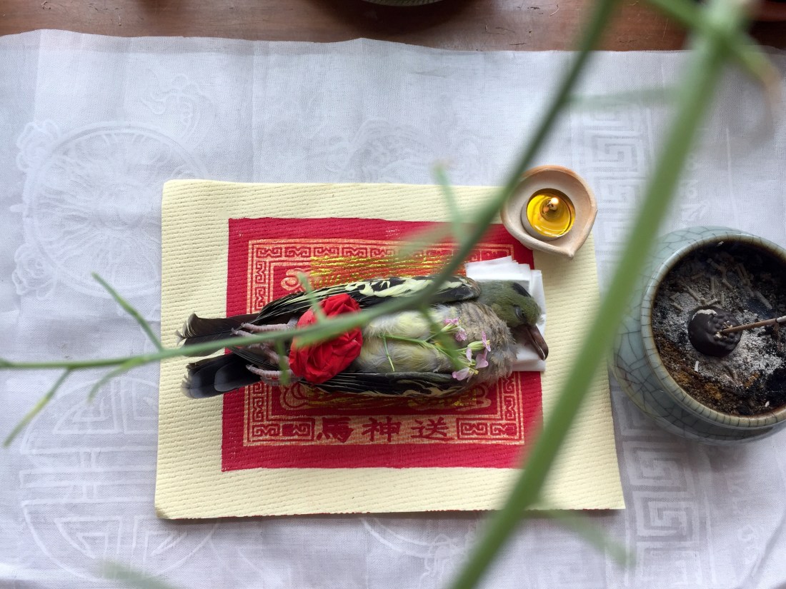 In the evening, I wrapped them in a khata and buried the bird under a young tree, with my mother’s help.