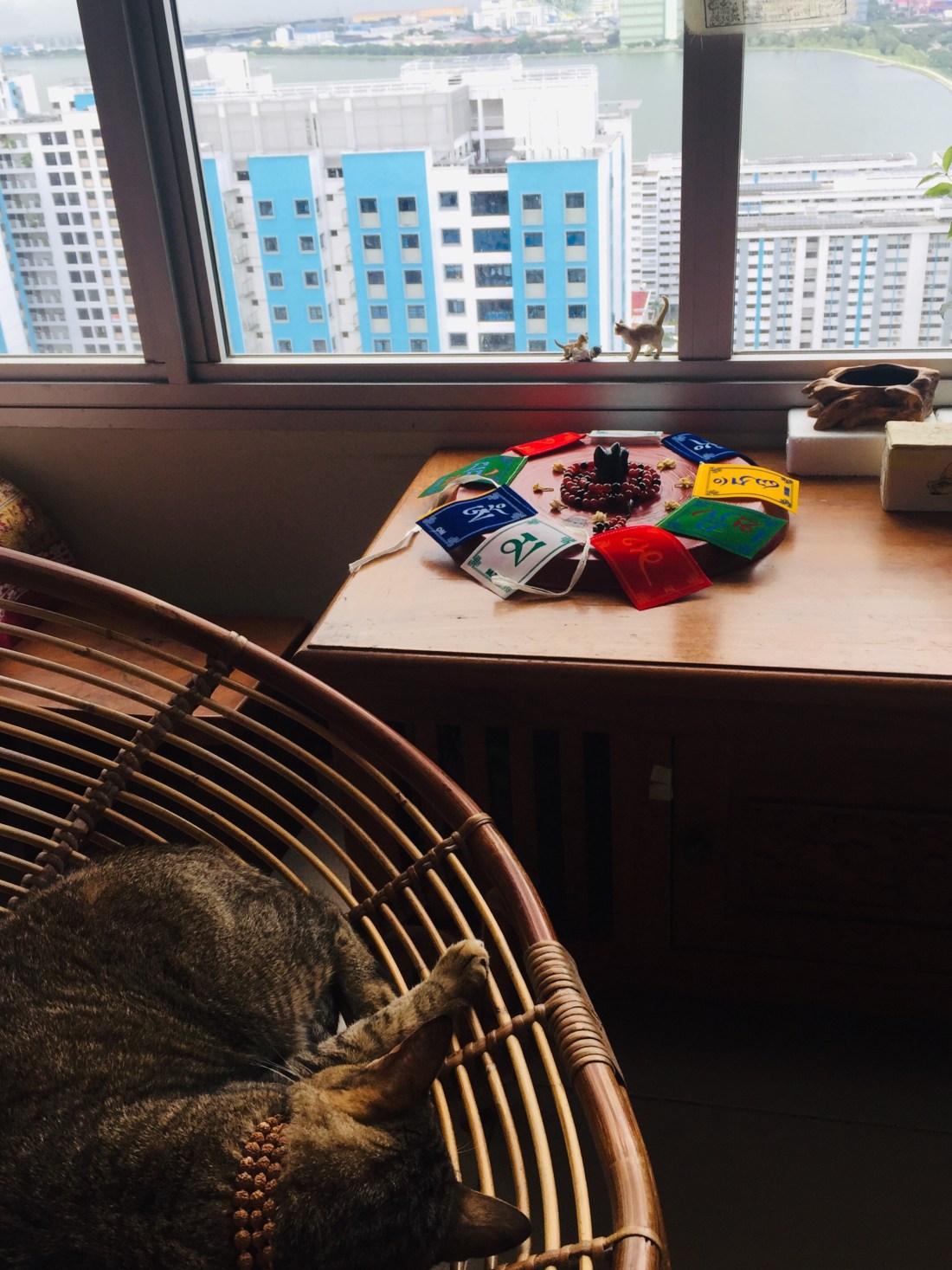 Oliver did not protest when I put the mala beads over his neck. He simply went onto another cane chair and continued his morning nap. 😄
