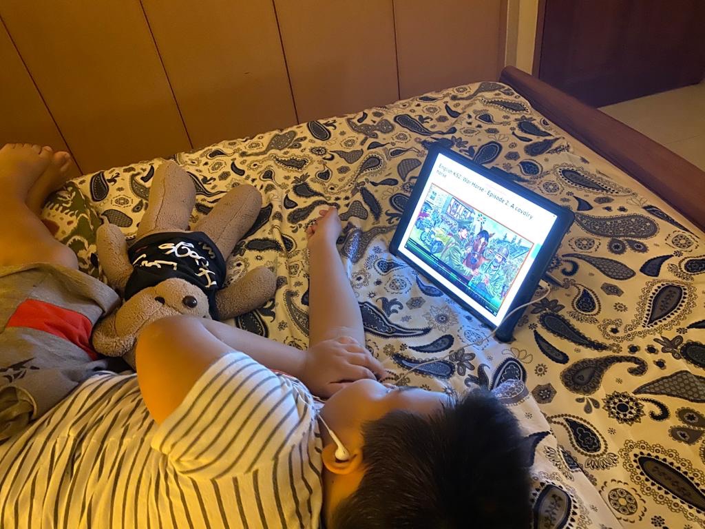 He listens to “War Horse” being read and learns to identify BBC accent from his favourite youtuber’s American accent. He likes Albert Narracourt a lot for his bravery and loyalty to Joey, his horse, and sketches out scenes from the book after his weekly reading aloud on ZOOM tuition.