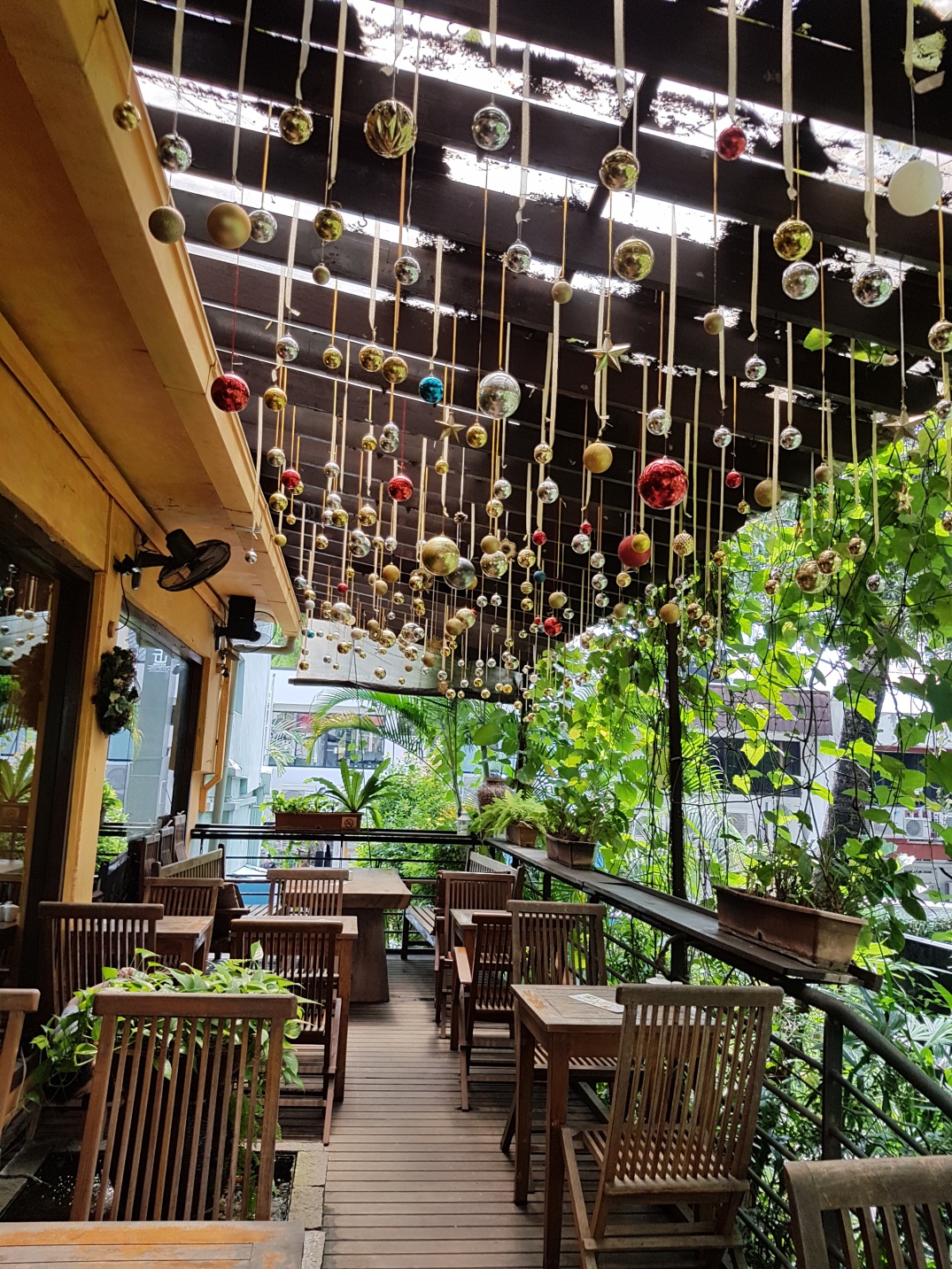 Yesterday I was at Holland Village with friends at a cafe that serves english fare in an Enid Blyton setting. The winged sofas, the mantelpiece of ceramic animals, the glittery christmas tree and overly tinseled beams and pillars of Fosters filled me with gratitude.