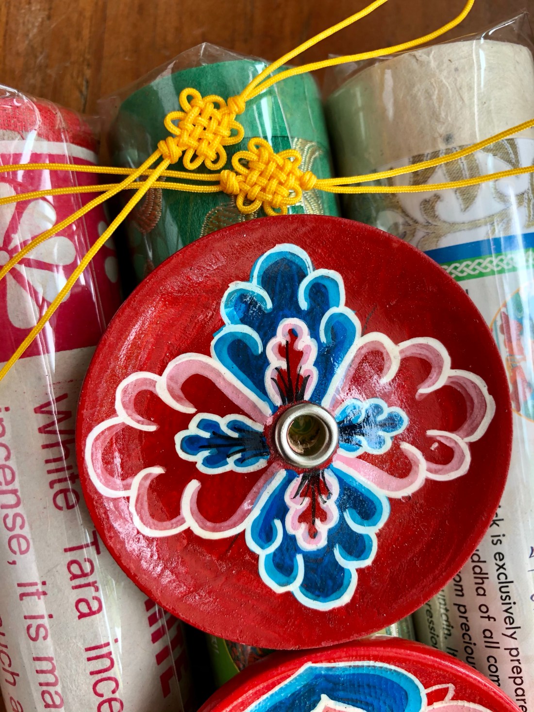 “Here, you take these. They are made by the lamas,” she spoke softly, as she placed an auspicious symbol of infinite wisdom and the union of empathy and knowledge woven in yellow thread in my hand.