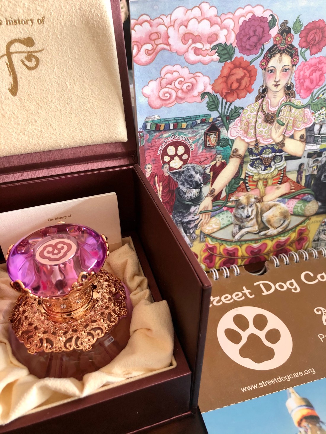 Its hues, gold and crystal details immediately reminded me of Goddess Tara as envisioned by the artist who drew it for Street Dog Care in Nepal a few years back.