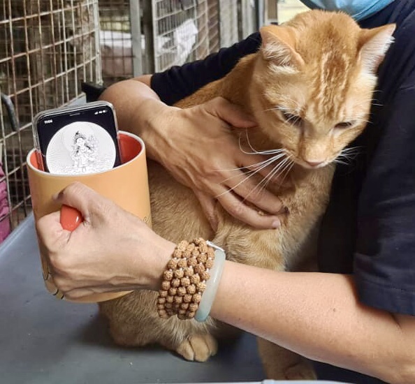 At the shelter this morning I found a mug to hold my iphone to amplify the song of White Tara for the cats and dogs.