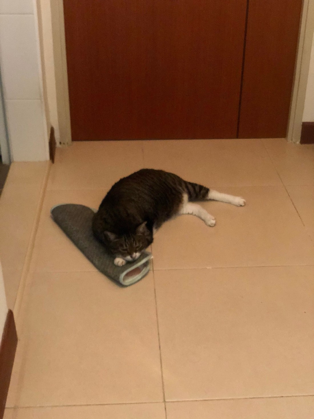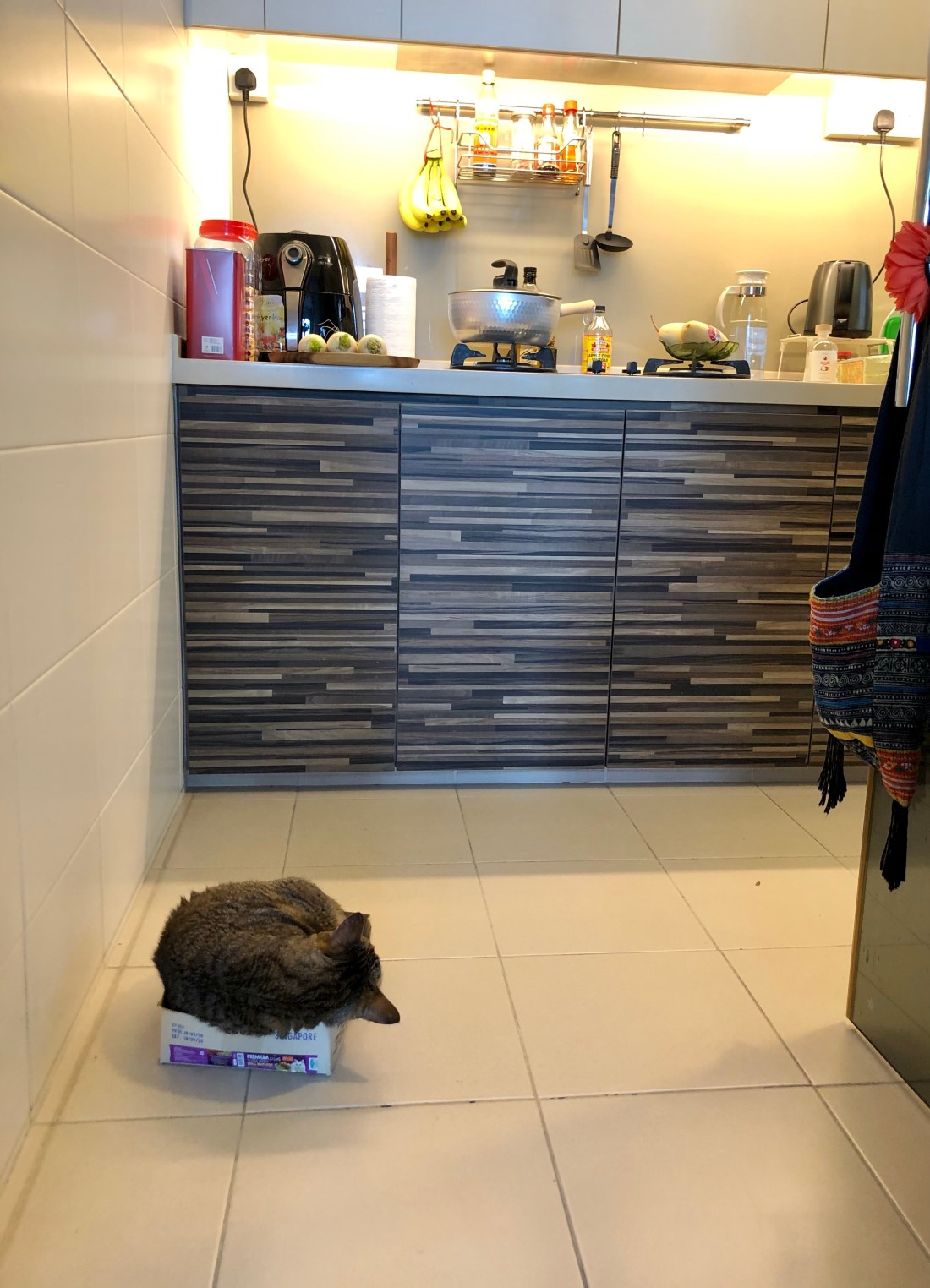 Good natured Oliver then retreated to the kitchen and squeezed into the tuna can carton on the floor for his nap.