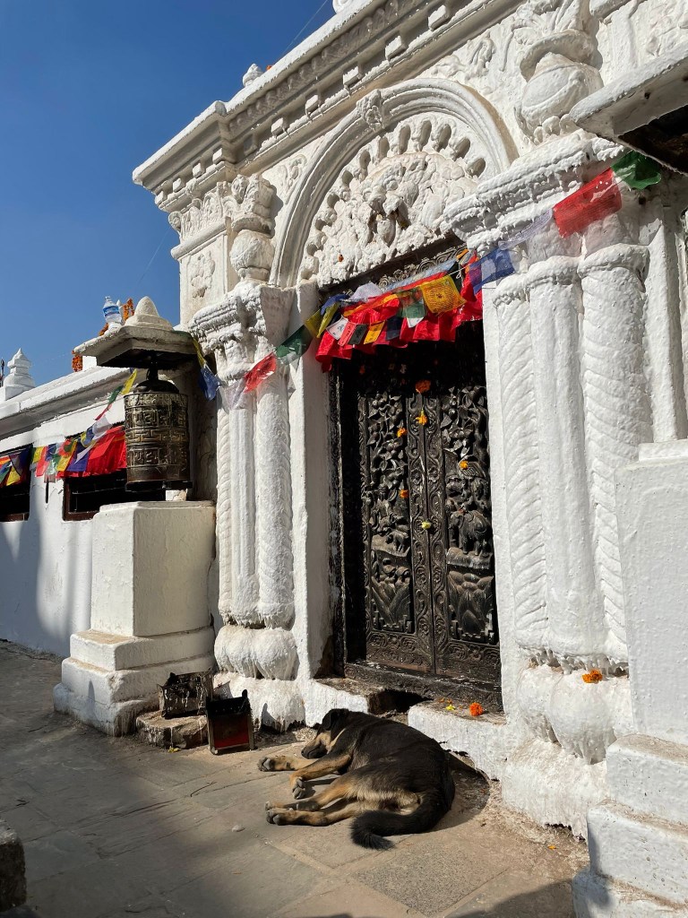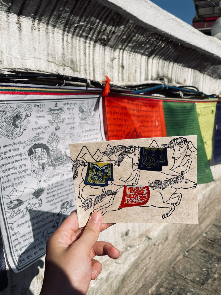 One of the things the young lady did when she reached the Boudha Stupa was to take out her windhorse card and take pictures of it with the prayer flags.
