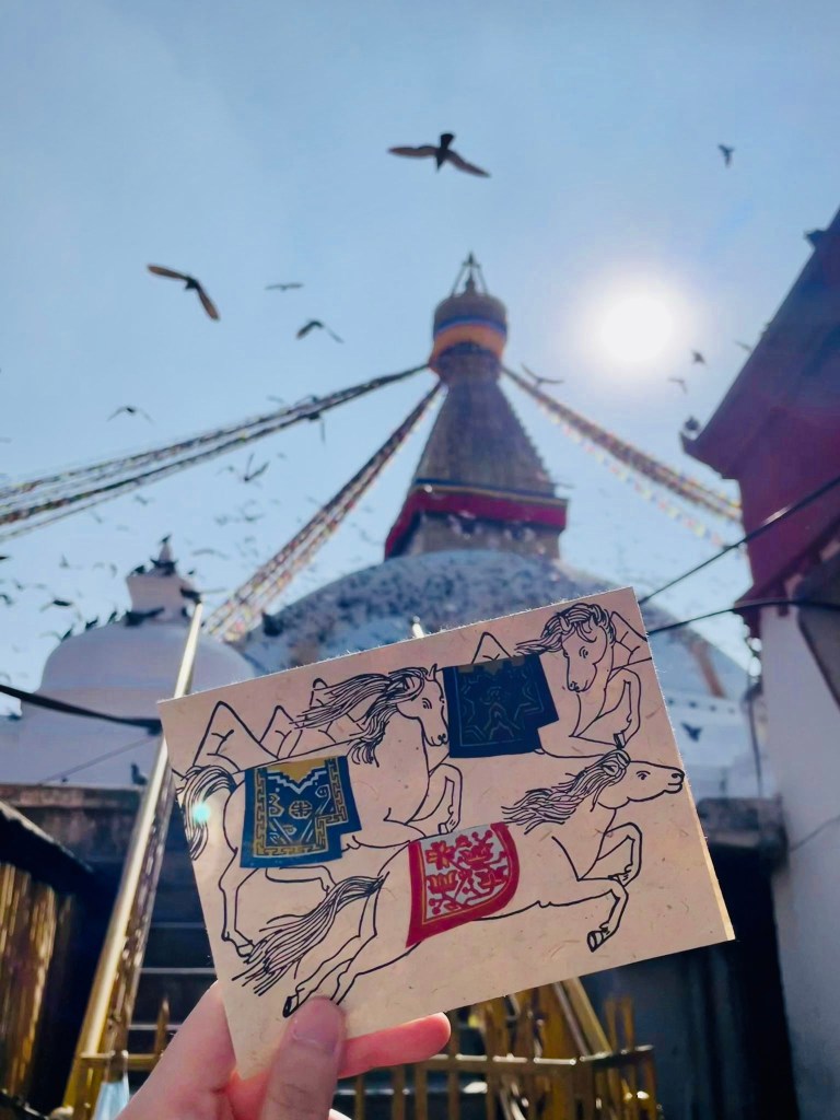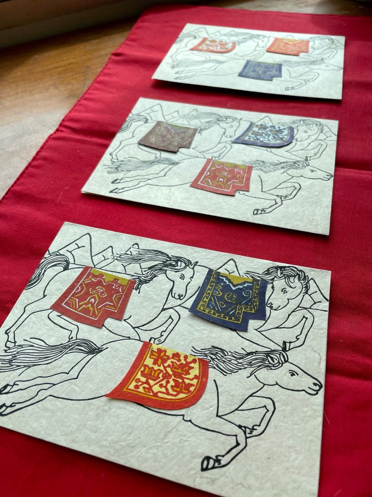 Recently a former student was heading to Nepal. By way of wishing her a trip filled with pleasant encounters & learning ease, I gave her a handmade card featuring a mythical horse.