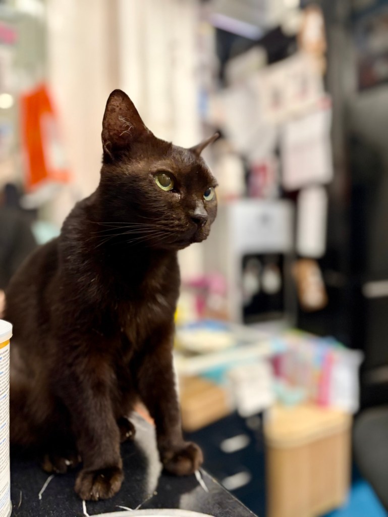 Tariqna, the senior black cat with green eyes had to be given up. Her previous human needed nursing care.