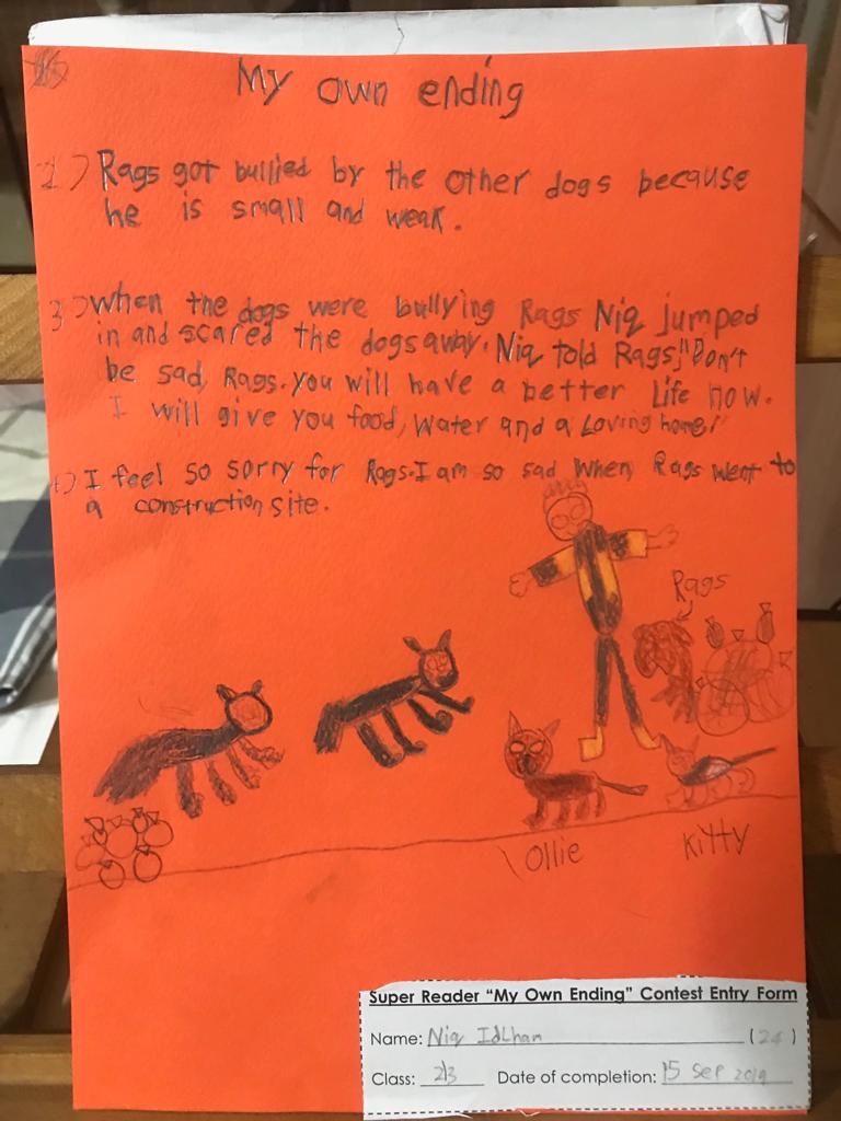 When I bought the “Diary of Rags” at the animal welfare event, I didn’t know one day a little Malay boy would need it for his English assignment, and show me a compassionate & courageous heart sitting in that 8-year-old body of his.