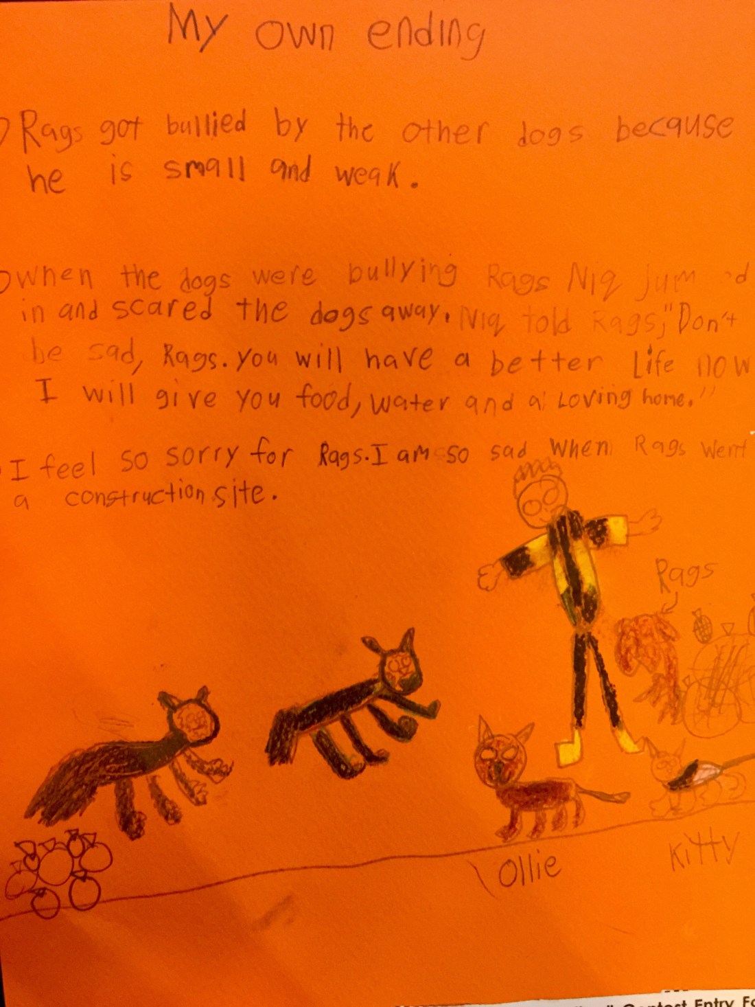 So for his alternative ending, First Tutee decided to put himself in the story. He went to the construction site and with outstretched arms, stood between Rags and the bullies.