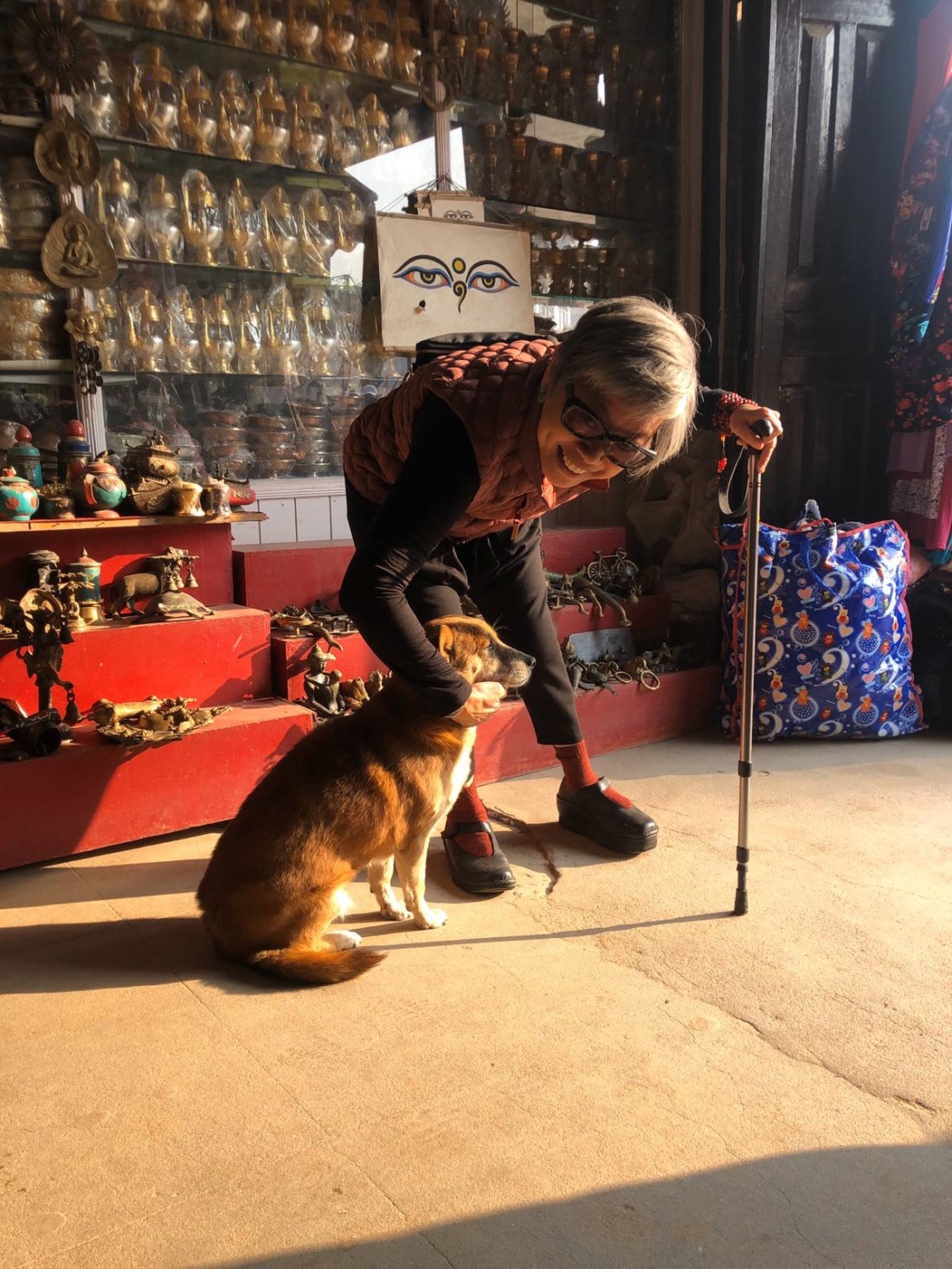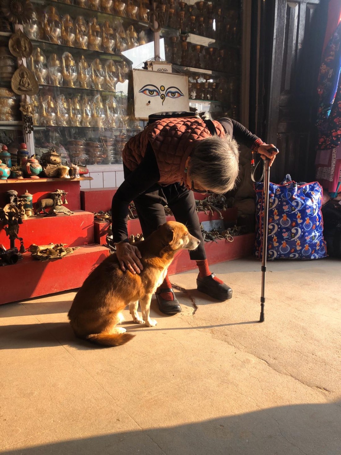 I saw this spritely grandma circumambulating the stupa in the midday sun in 2018. This year in 2019, I spotted her among the pilgrims, but she was too fast for me to take a picture with. So I gave up the idea completely. But my wish was fulfilled when we wandered into an alley to look at tibetan fabrics and she walked right into our path!We took tea at Jamuna’s shop at Chetraparti. This dog named Jammy came to visit when we were looking at dear Kali who is now 15 years old.