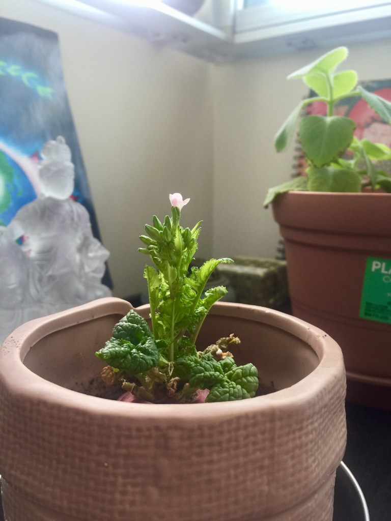 The little shrivelled red radish that showed the least promise has brought forth a tiny pink bloom.