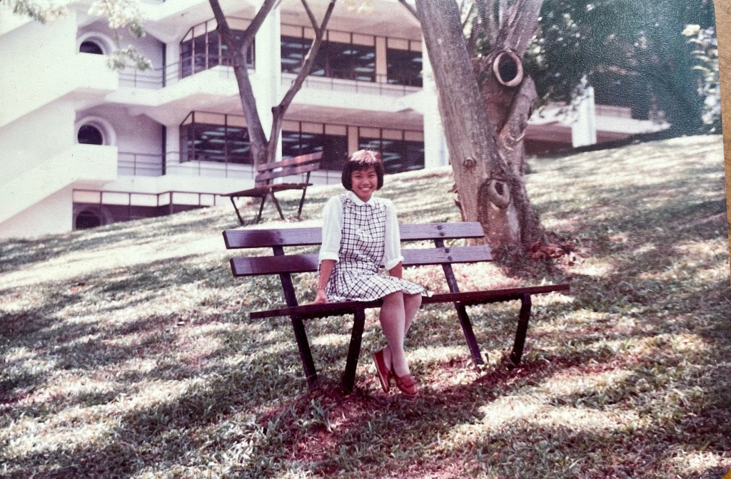 In my checkered pinafore and stockinged feet 36 years ago. (The Central Lending Libary of National University of Singapore, 1985)