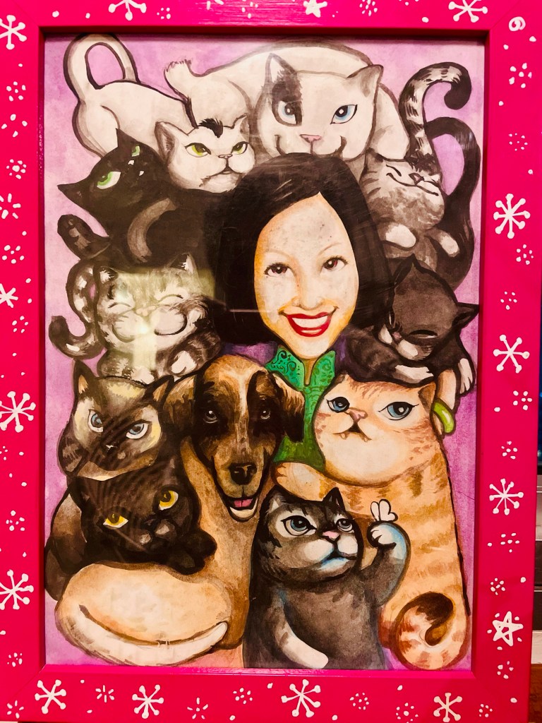 A talented friend draw this portrait of me in green qipao surrounded by my dog, Shoya, and my 10 cats in 2007.